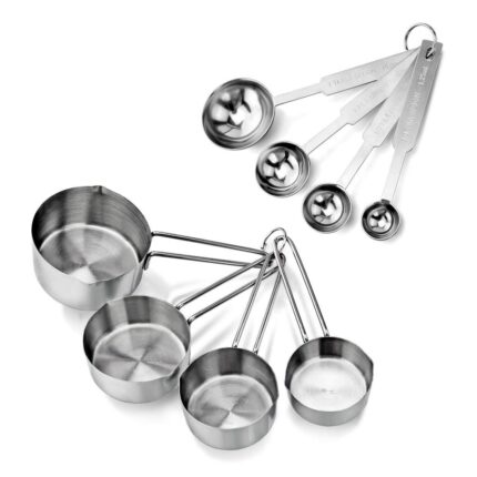 This stainless measuring cup and spoon set will be all you need in the kitchen. Stacking together for easy storage, held together by D-rings for easy access to remove individual pieces. The -piece design ensures you will never need to worry about a handle coming off, and makes cleaning easier, eliminating tricky cracks. The engraved measurements eliminates the possibility of rub-off in the future, and trying to guess which is which.
