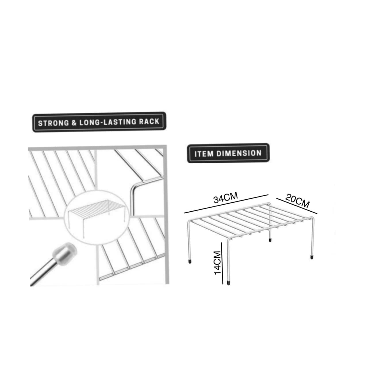Size of this stainless steel rack is – (L) 31.5 X (W) 20.5 X (H) 15.5 cm. This multipurpose steel rack can serve all your basic needs for storage and partition solutions efficiently.MATERIAL: Made From High Quality Stainless Steel Material, Nickel Chrome Plated. Long Lasting Shine And StrengthThis rack comes with Anti-Skid Rubber fittings in its legs which ensures that your floor stays scratch-free and it prevents rack from slipping. You can start using this rack/shelf as soon as your re-ceive the product. It can be placed on Kitchen/Bathroom/Cabinet/Office Floor/Platform. This stainless steel shelf can be of best use for making partitions or dividing the space to keep maximum products.