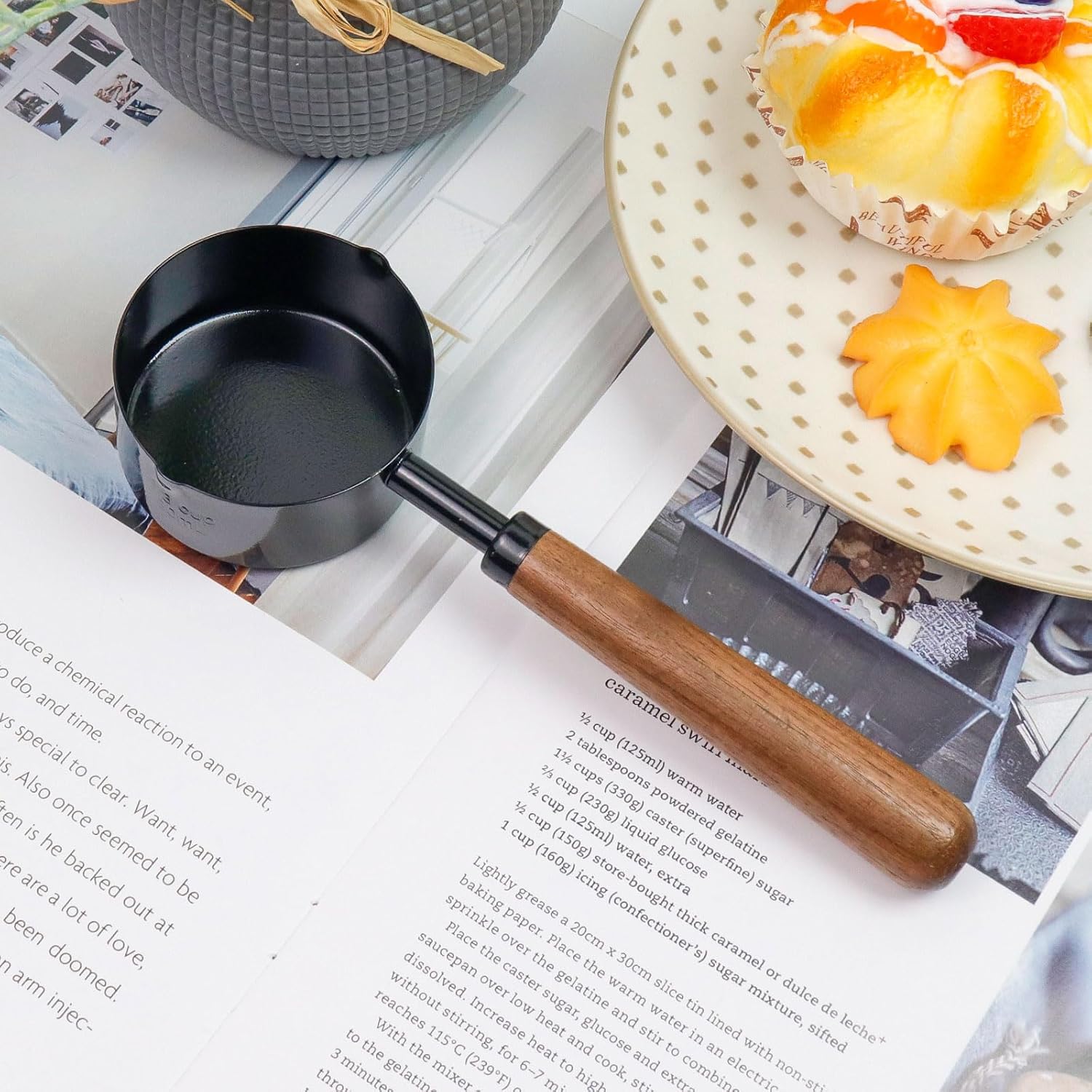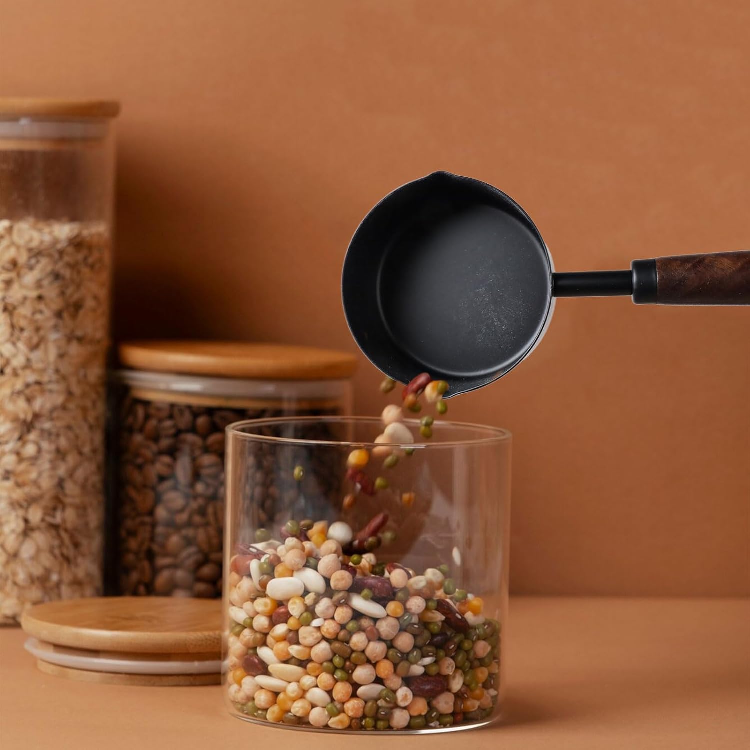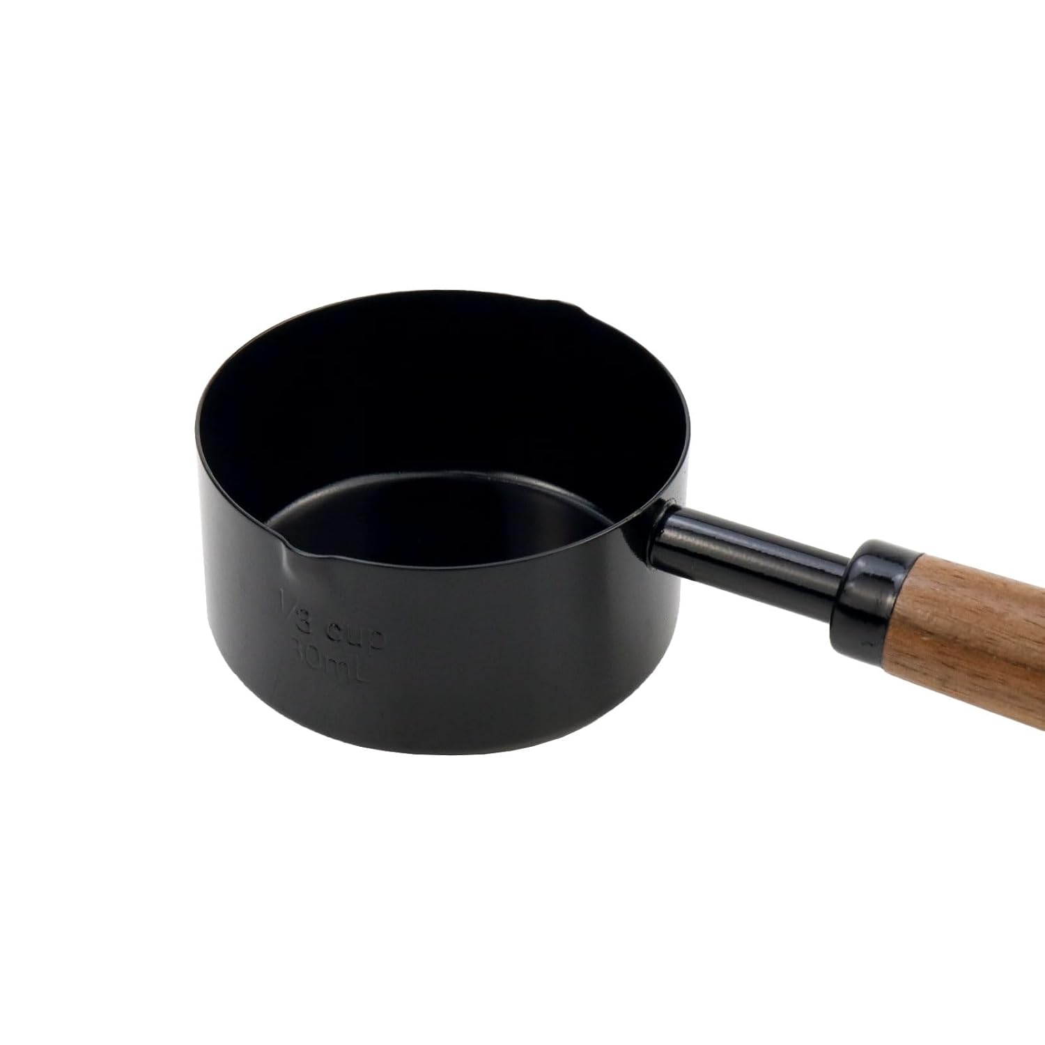 -Design: The black metal measuring cup with a wooden handle have a smooth surface and a comfortable grip. The cup also have a clear measurement scale, which is very convenient for your cooking and baking.