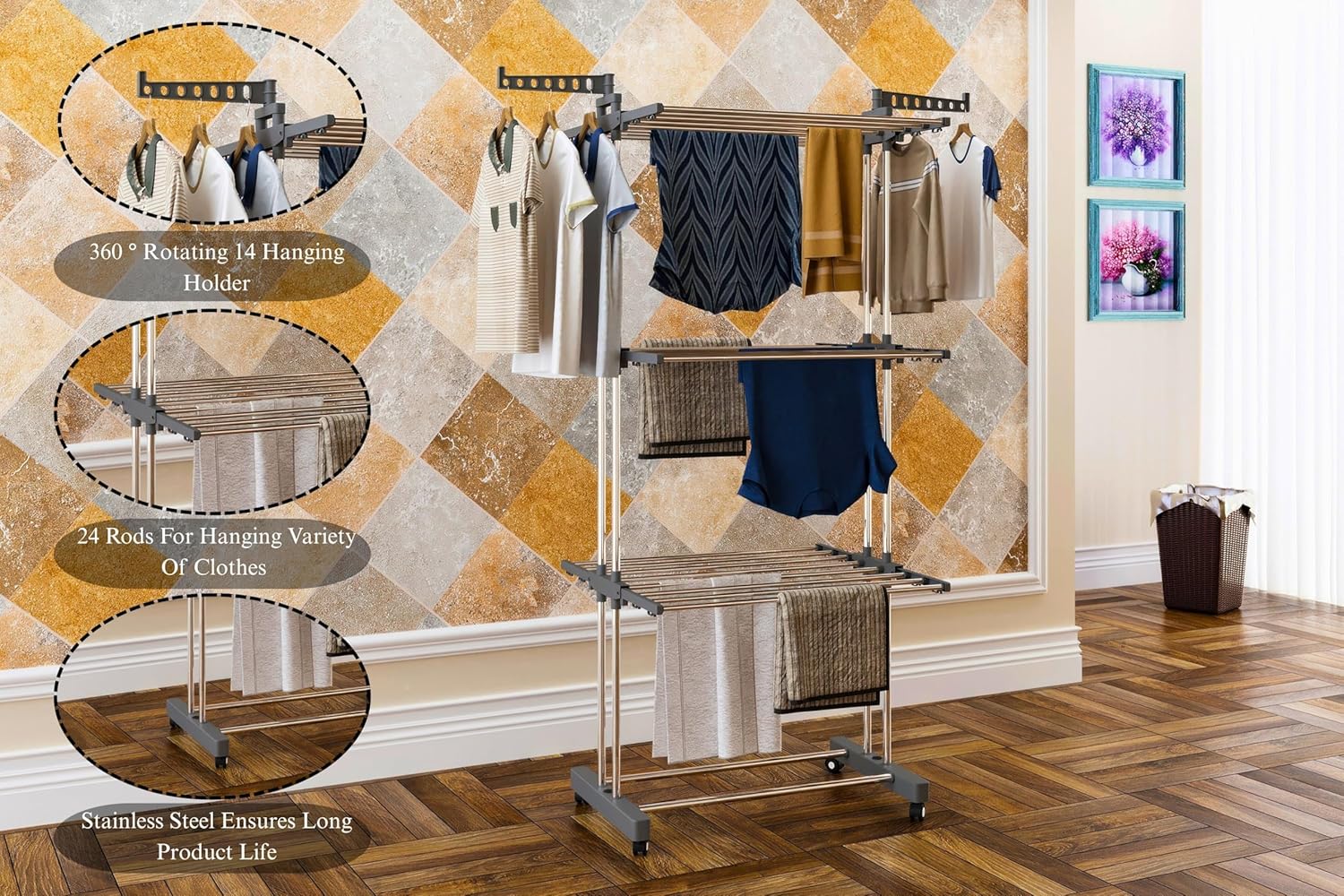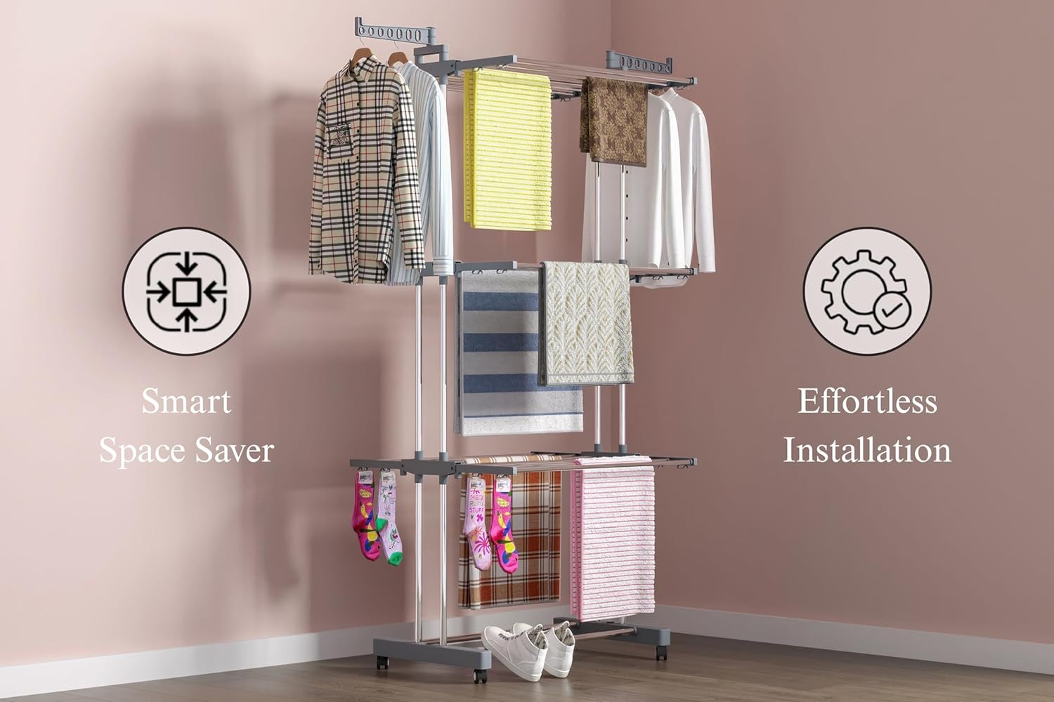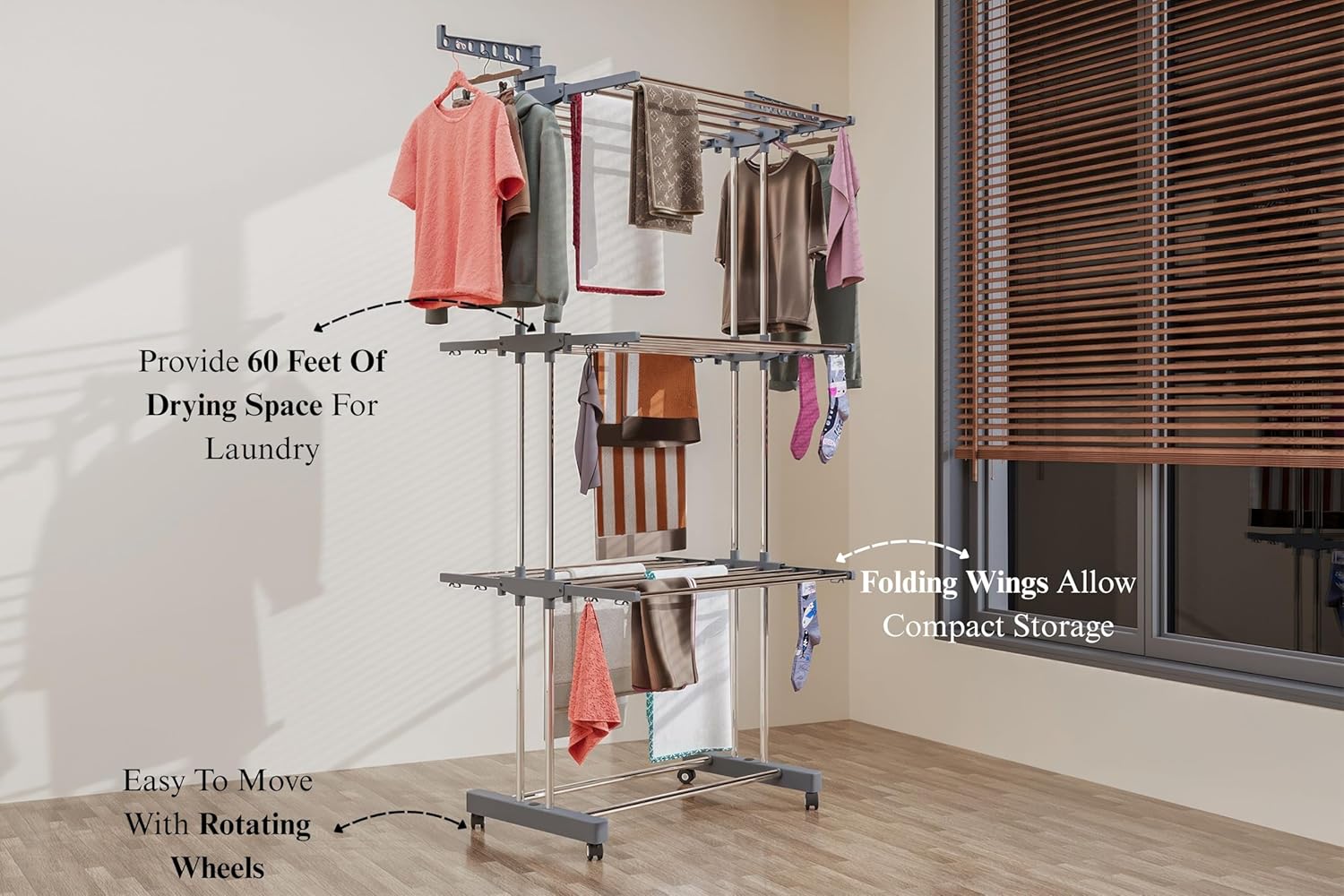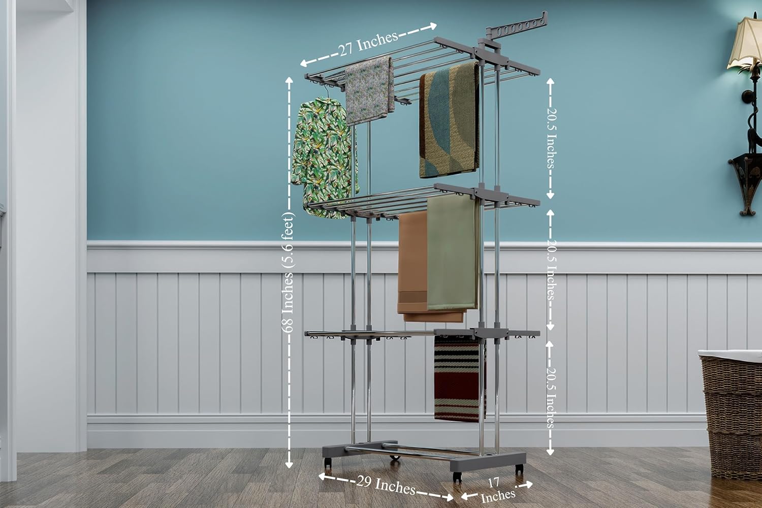 homWell Heavy Duty Stainless Steel Premium 3 Layer Tier – 16 Rods Cloth Drying Stand Foldable | Cloth Dryer Stand Steel Clothes Stand for Drying | Stand for Clothes | Cloth Stand for Drying Foldable