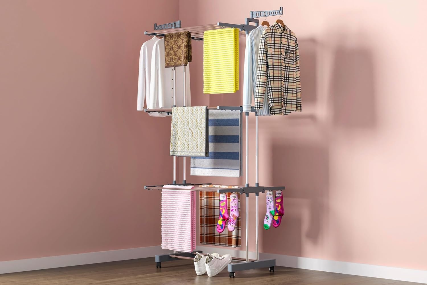 VERSATILE & MULTI-USE – Designed for both indoor and outdoor drying—great for balconies, terraces, laundry rooms, or during rainy seasons and winter months.