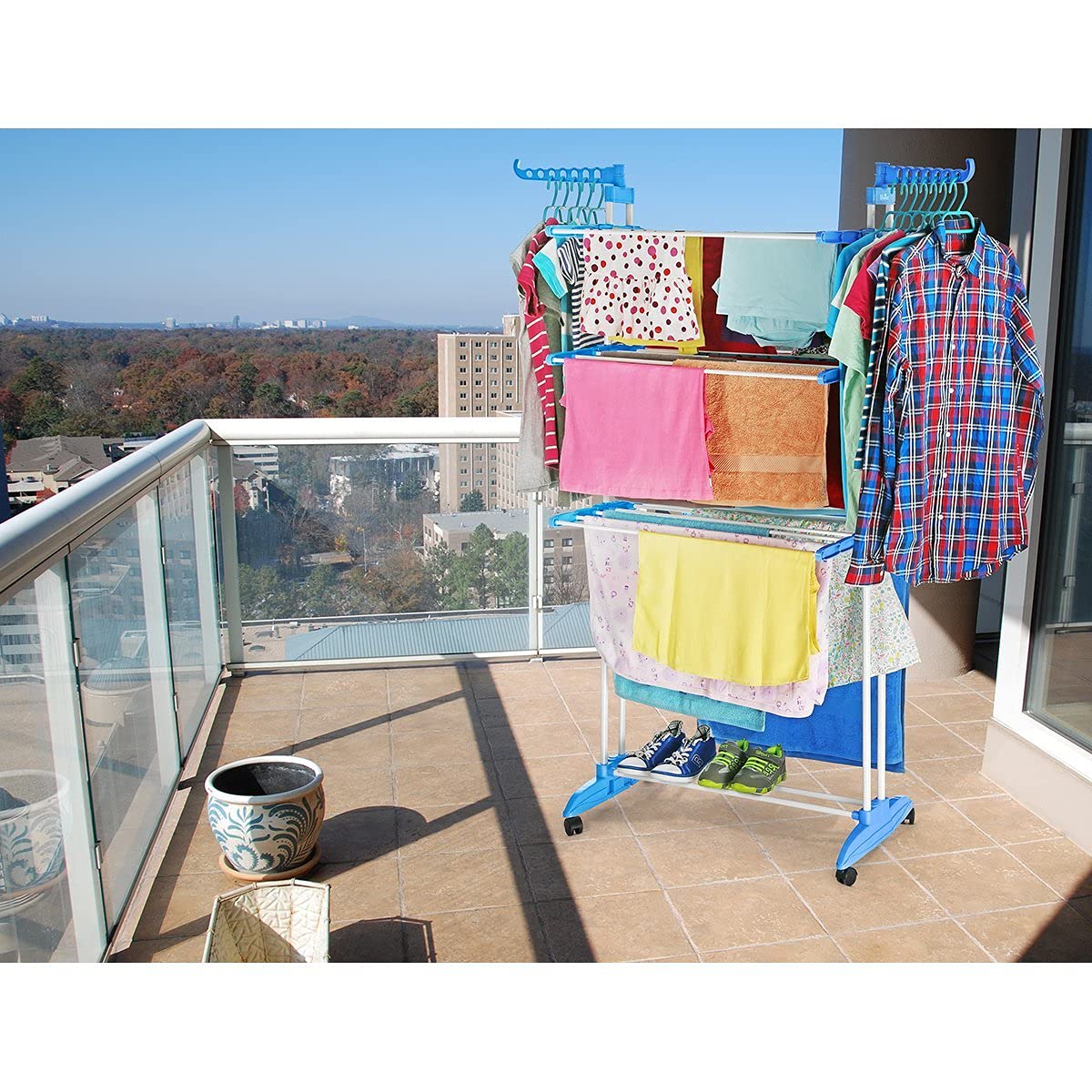 Folding Double Supported 3 Layer Cloth Drying Stand Laundry Dryer Hanger with Breaking Wheels for Balcony Indoor and Outdoor Home, Steel (Blue)