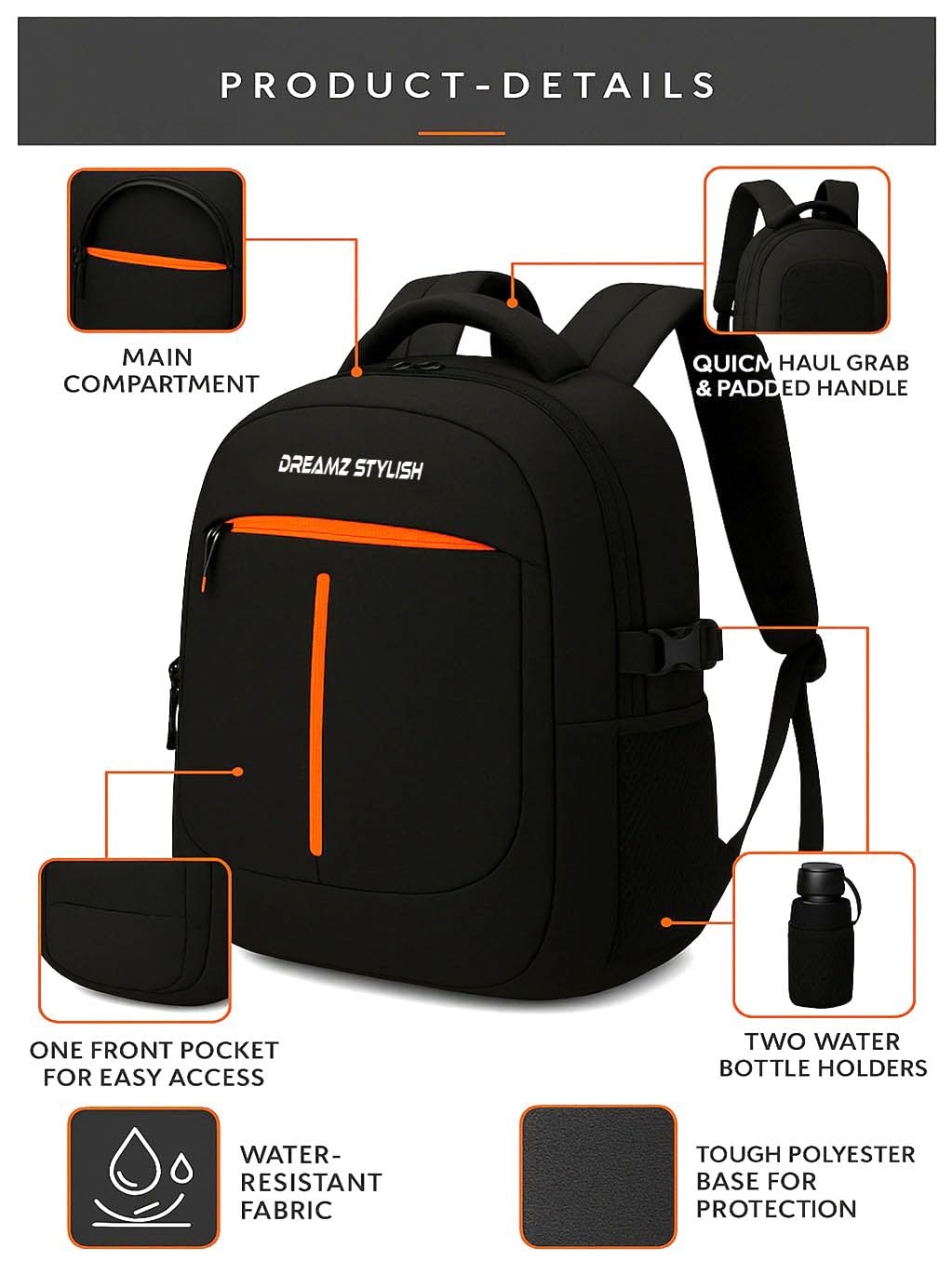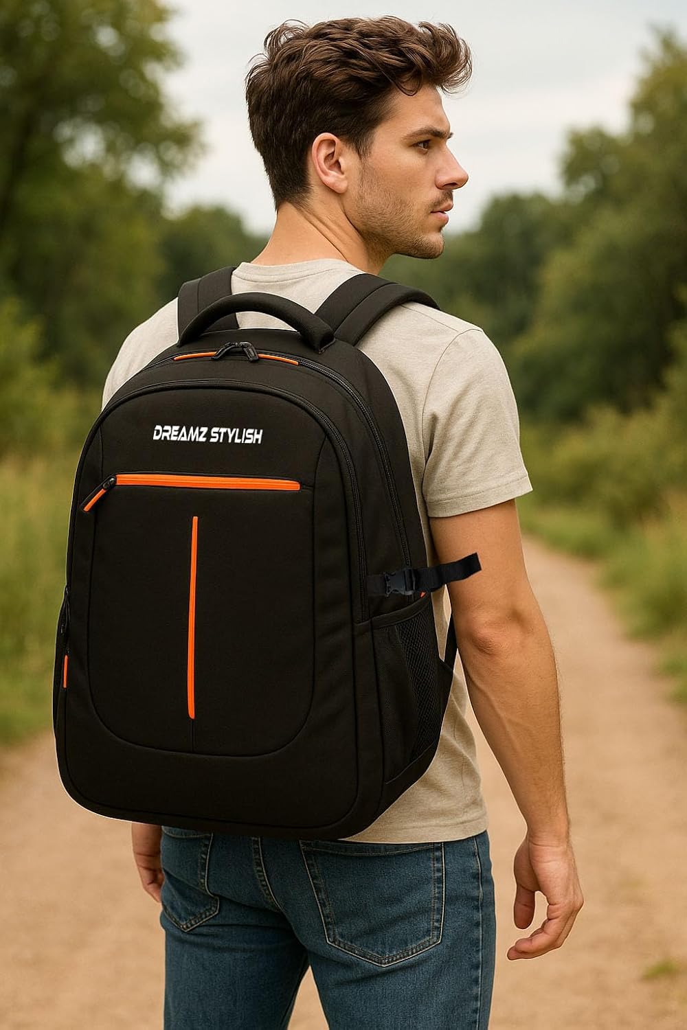 Carry your essentials in style and comfort with the DREAMZ STYLISH Laptop Backpack — a perfect blend of functionality, durability, and modern design. Made with premium water-resistant fabric, this backpack keeps your belongings safe from light rain and splashes. The spacious multi-compartment design provides ample storage for laptops, books, clothes, accessories, and more, making it ideal for work, college, or travel. The ergonomically padded shoulder straps and back support ensure comfort even during long hours of wear. With its sleek black design accented with bright orange highlights, this backpack offers a stylish yet professional look suitable for both men and women. Whether you’re heading to the office, college, or a weekend trip, the DREAMZ STYLISH Backpack is built to handle it all — with strength, space, and style.