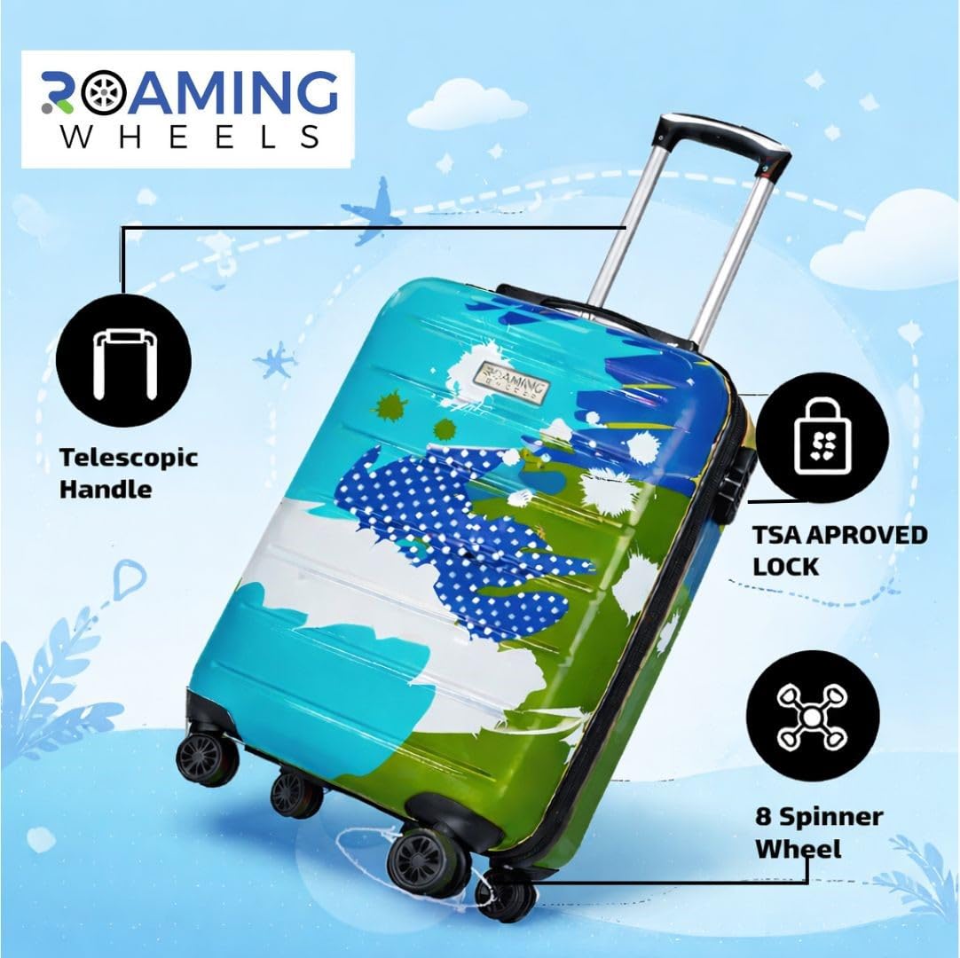 ROAMING WHEELS Printed Travel Luggage Trolley Bag Set with 24 inch, 20 inch and 18 inch sizes is designed to support organized packing for short stays, long journeys and family travel, featuring a structured outer body with modern printed finish, smooth 8 wheel movement for steady rolling on different surfaces, number lock system and strong zipper closure to help keep belongings secure, along with top and side carry handles for flexible lifting while moving through airports, railway stations or hotels, the roomy interior includes packing straps and zip divider to separate clothes, footwear, toiletries and accessories, helping maintain order during travel, the compact 18 inch suitcase suits essentials and quick trips, the 20 inch works for cabin packing and the 24 inch supports extended travel storage, while the lightweight build allows comfortable handling, this trolley bag set fits business tours, college trips, holiday journeys and weekend planning, offering practical inner compartments for documents, gadgets and personal items, making it easier to arrange belongings and move smoothly from one destination to another with balanced structure and functional design throughout the travel experience.