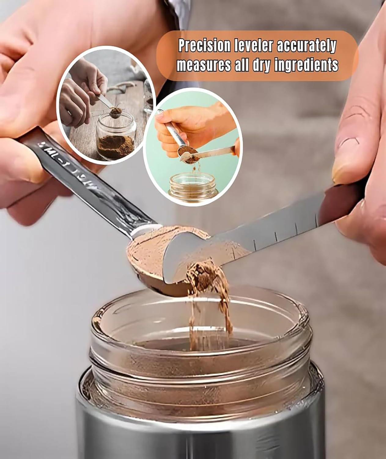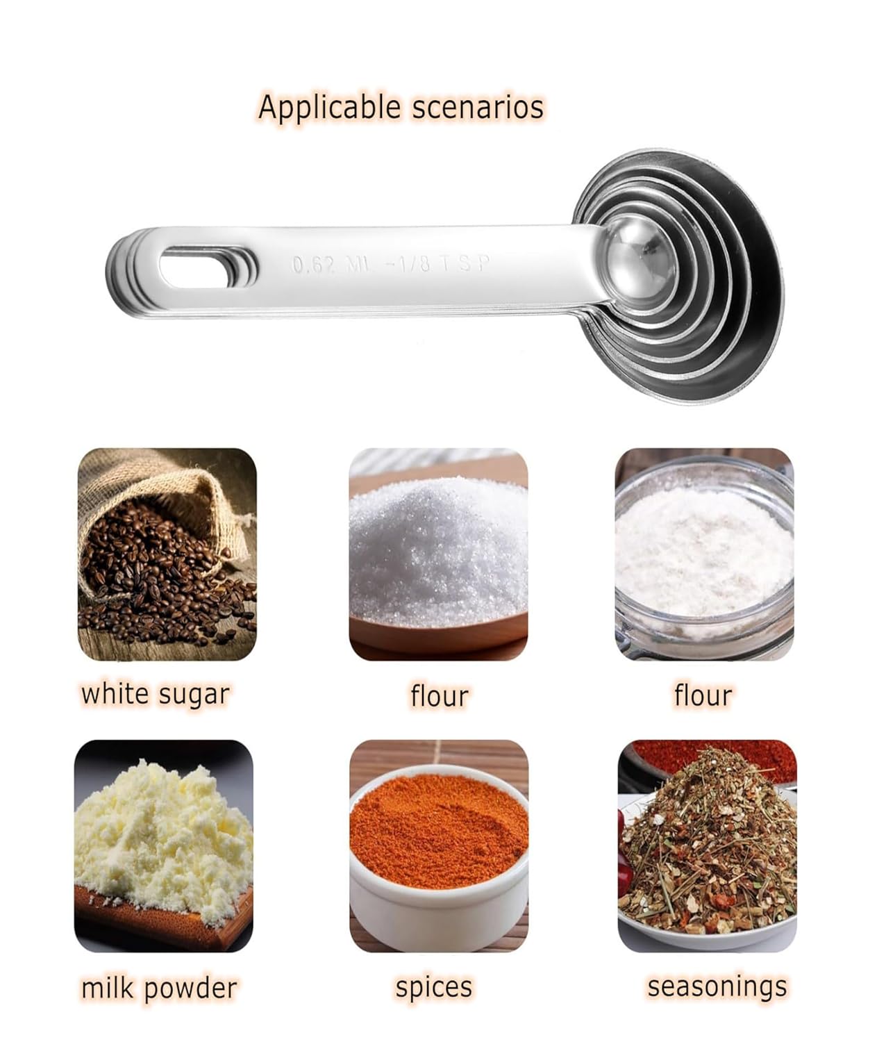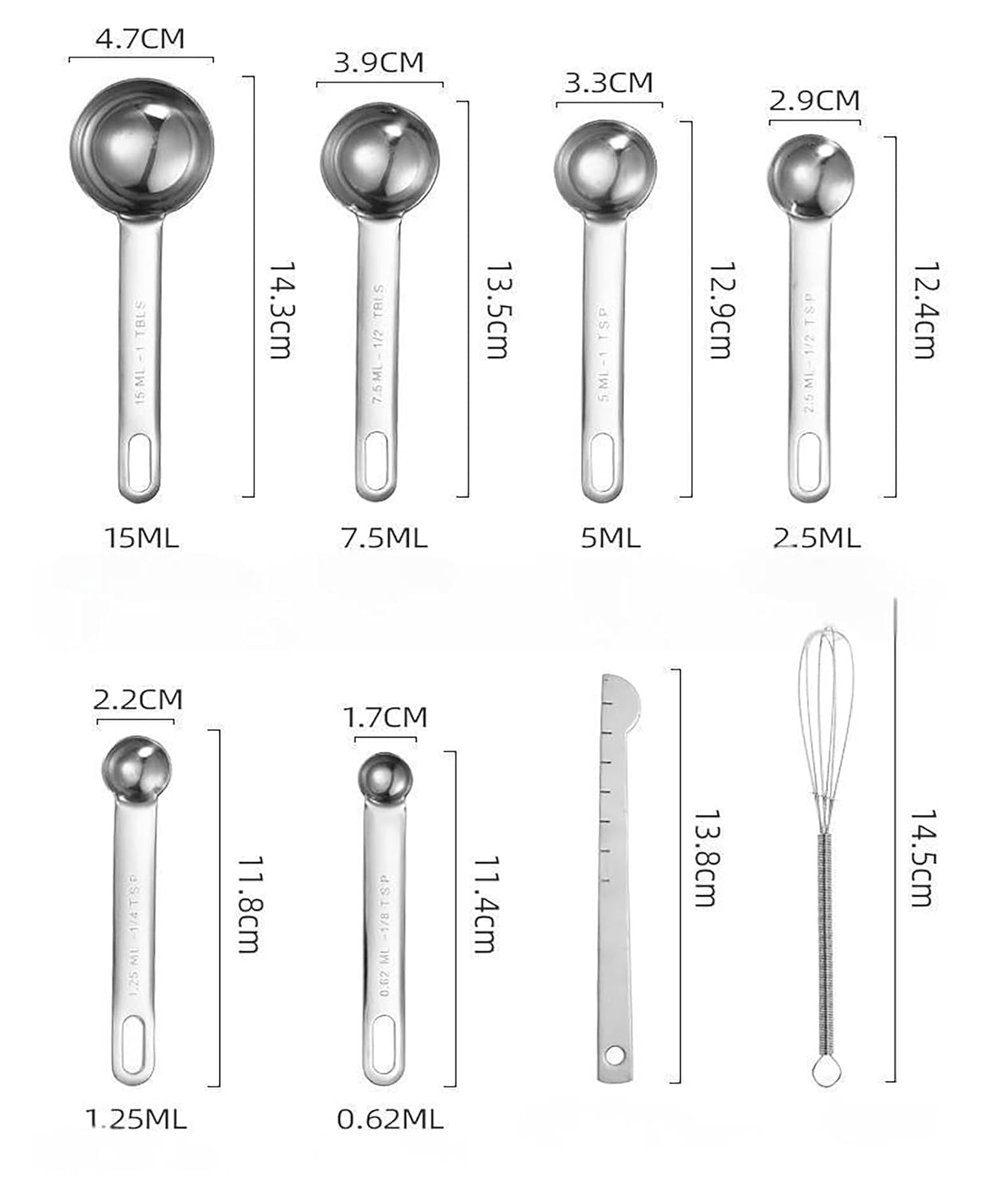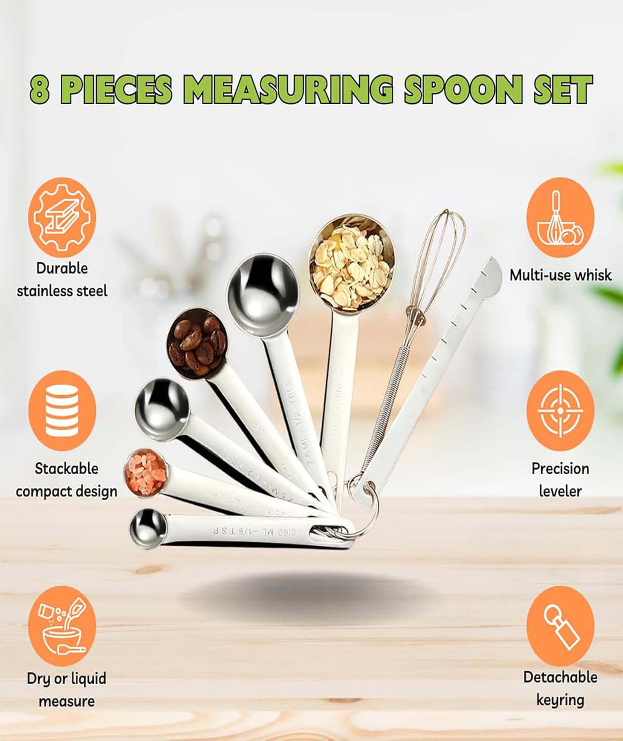 The Packaging Includes: The 8-piece set contains 6 measuring spoons, a scraper, and a whisk. Ideal for precise measurements of dry or liquid ingredients like spices, flour, or oil.
