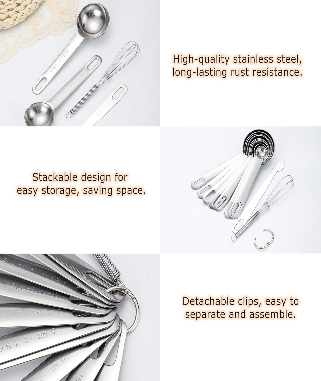 Versatile Utensils: The measuring cups and spoons set includes a mini whisk for mixing and a scraper for leveling ingredients. The stainless steel design allows seamless transitions between dry and liquid measurements without residue buildup.