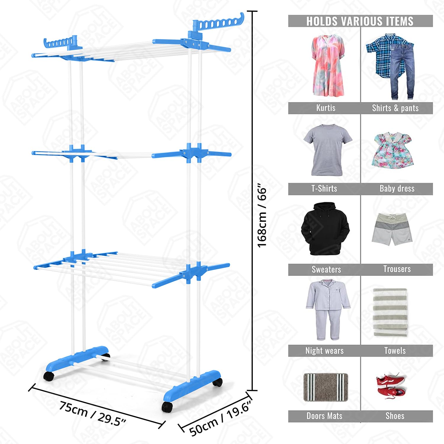 ABOUT SPACE 5.5 ft Cloth Drying Stand Folding – 3 Layer Clothes Drying Stand for Balcony, Portable with Castor Wheels, 24 Hanger Rods & 2 Wings – Anti Rust Steel Double Pole (Blue – L 75 x B 50 x H 168 cm)