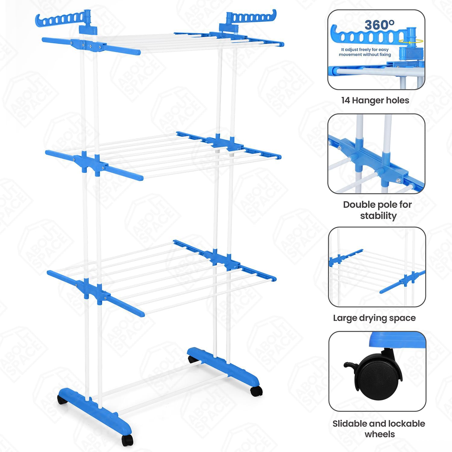 ABOUT SPACE 6 ft Clothes Drying Stand – 3 Layer Foldable Cloth Dryer Stand, Portable with Castor Wheels, 24 Hanger Rods & 2 Wings – Anti Rust Steel Sturdy Pole (Blue – L 75 x B 55 x H 165 cm)