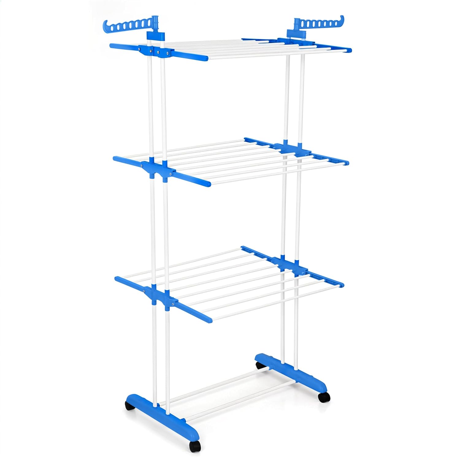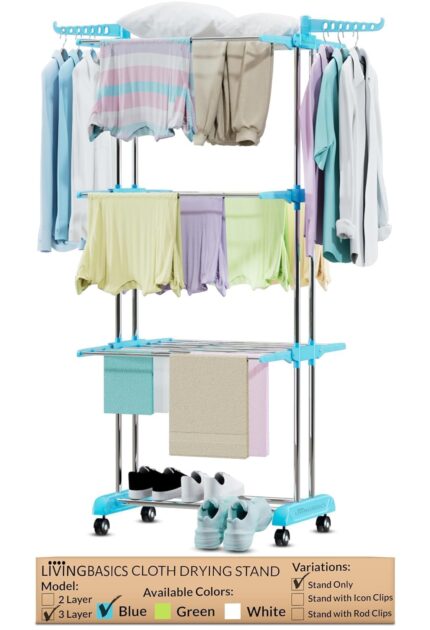 LIVINGBASICS 3 Tier Premium Heavy Duty Stainless Steel Foldable Cloth Drying Stand/Clothes Stand for Drying/Cloth Stand/Clothes Dryer/Laundry Racks for Drying – Indoor/Balcony (Cyan Blue)