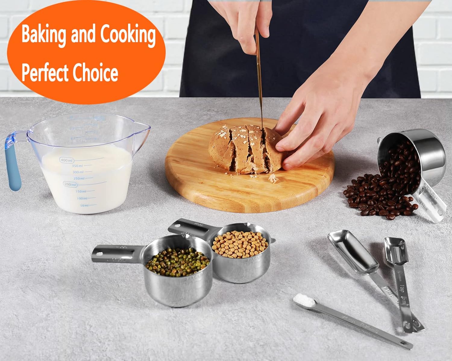 [Multiple Sizes of 20]: Including 7 stainless steel measuring cups (1 cup, 3/4 cup, 2/3 cup, 1/2 cup, 1/3 cup, 1/4 cup, 1/8 cup), 6 stainless steel measuring spoons (1 tbsp, 1 tsp, 3/4 tsp, 1/2 tsp, 1/4 tsp, 1/8 tsp), 3 liquid plastic measuring cup (4 cup, 2 cup, 1 cup), with 1 leveler, 1 measuring conversion chart & 2 metal rings. Meet all your needs on cooking and baking.