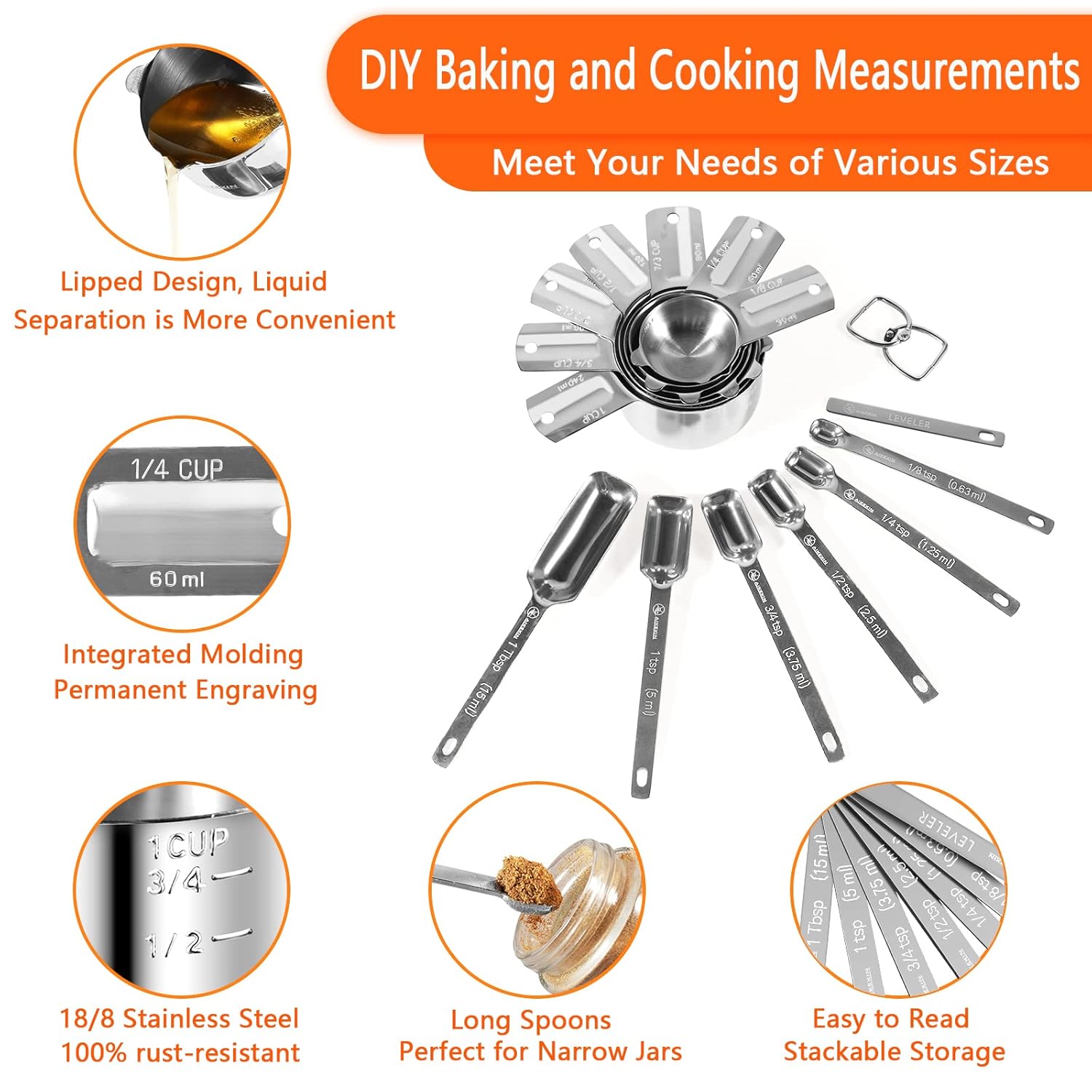 [Easy to Clean and Store]: Stackable professional measuring cups and spoons set is easy to clean, which can be safely put into the dishwasher after use. Metal rings allow them to be stored in drawers or hung on hooks in the kitchen, which not only save space but also perfectly keep the kitchen clean. (but for the plastic cups, manual cleaning is recommended).