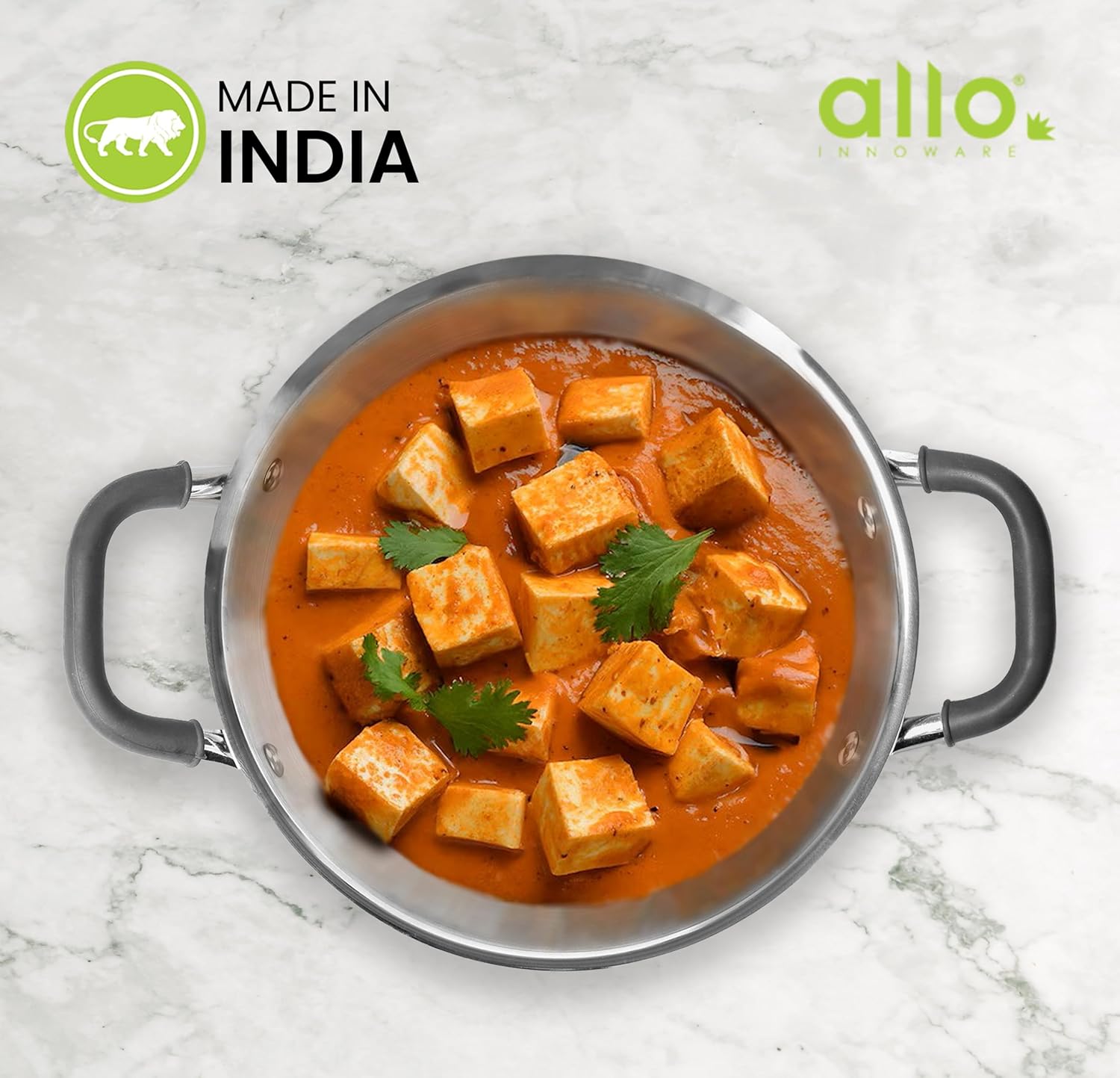 ✔I AM INDUCTION FRIENDLY BASE STEEL KADHAI – Are you looking for an induction base kadhai or heavy bottom steel kadhai which you can use on Induction, Gas Stove, and Oven as well? Well, your search ends here. You just found a match with Allo CookSafe triply stainless steel cookware range. ✔I AM MADE IN INDIA – I am proudly handcrafted in India but I would love to explore the taste of international cuisines with you.