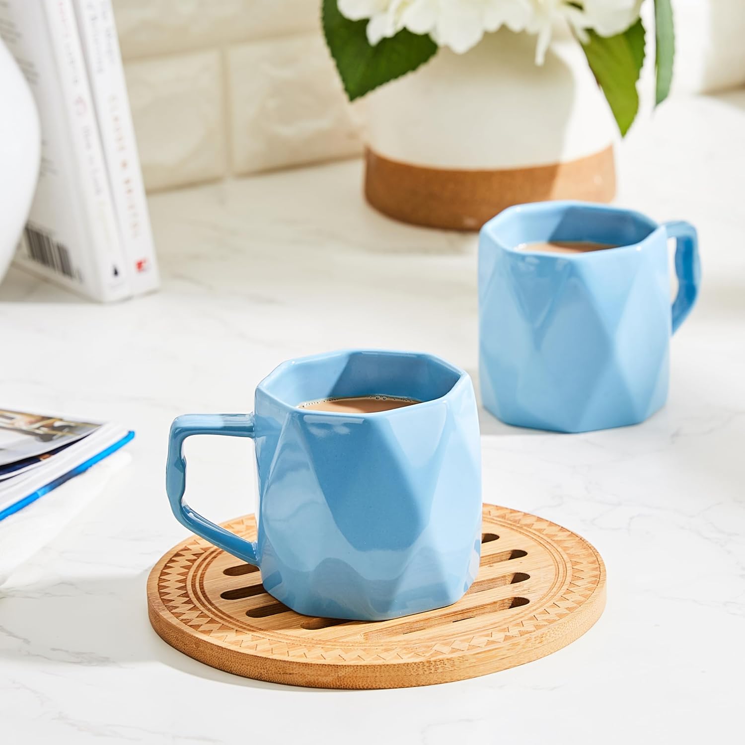 Serene Blue Mugs: Begin your day by savoring your preferred tea or coffee in beautifully designed sky blue mugs.