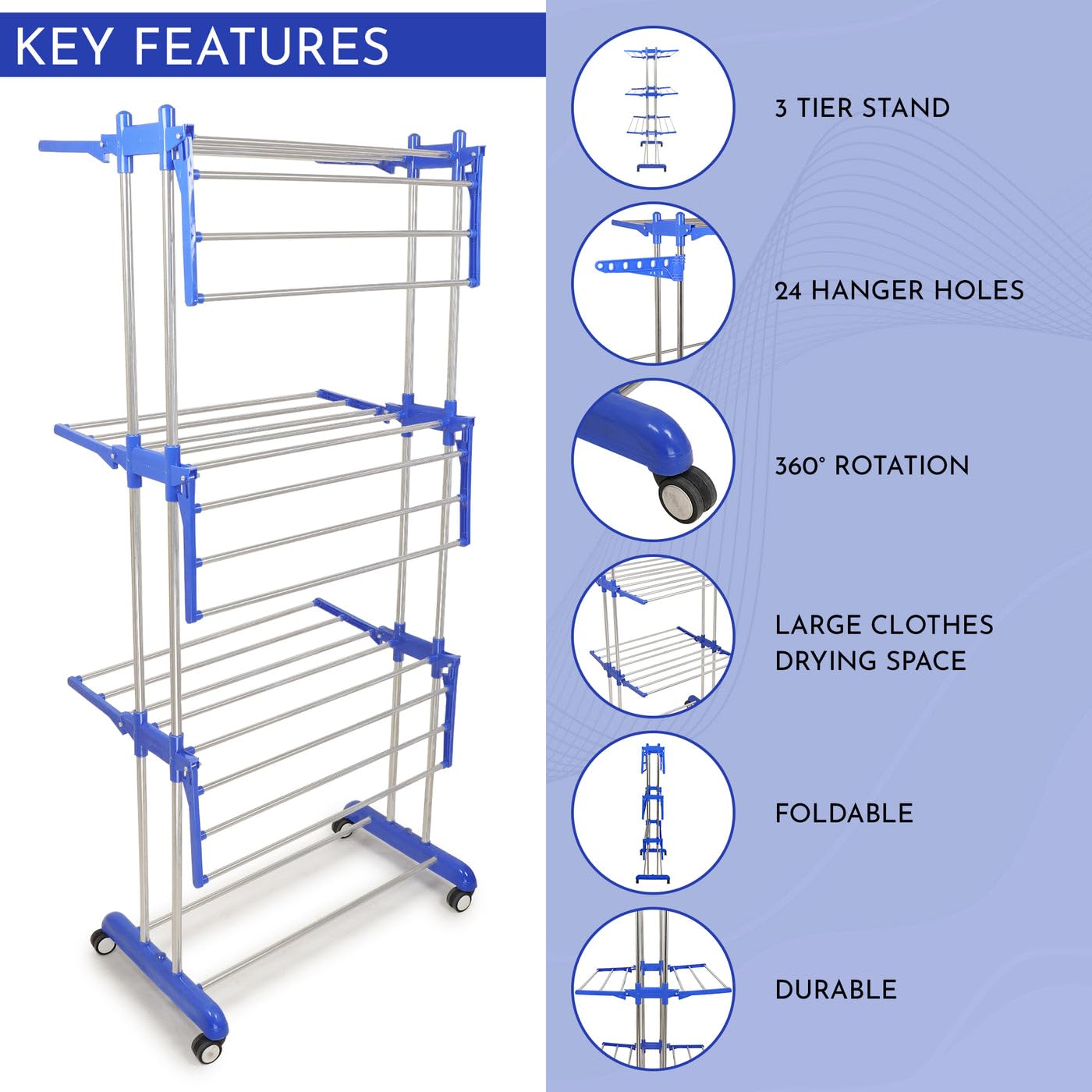 H Houseware Foldable Cloth Drying Stand Stainless Steel – 3 Tier Heavy-Duty Clothes Dryer for Balcony, Indoor & Outdoor Use | with Wheels & Hanger Slots | Rust-Proof Laundry Rack (Blue)