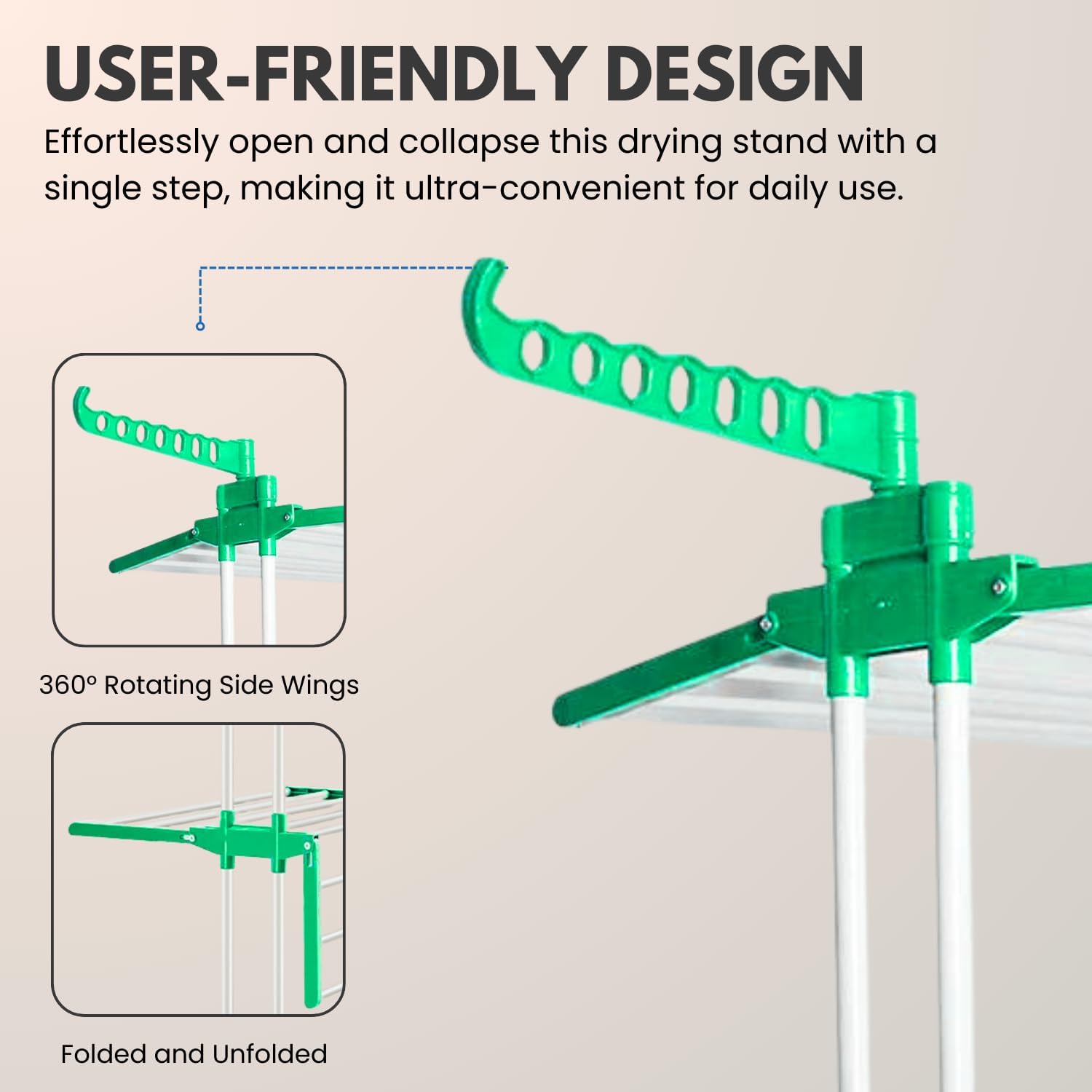 Amazon Brand – Solimo Premium Mild Steel Double Supported Single Layer Cloth Drying Rack | 56.5D x 126W x 94H cm | Foldable and Movable | White & Green | Lightweight