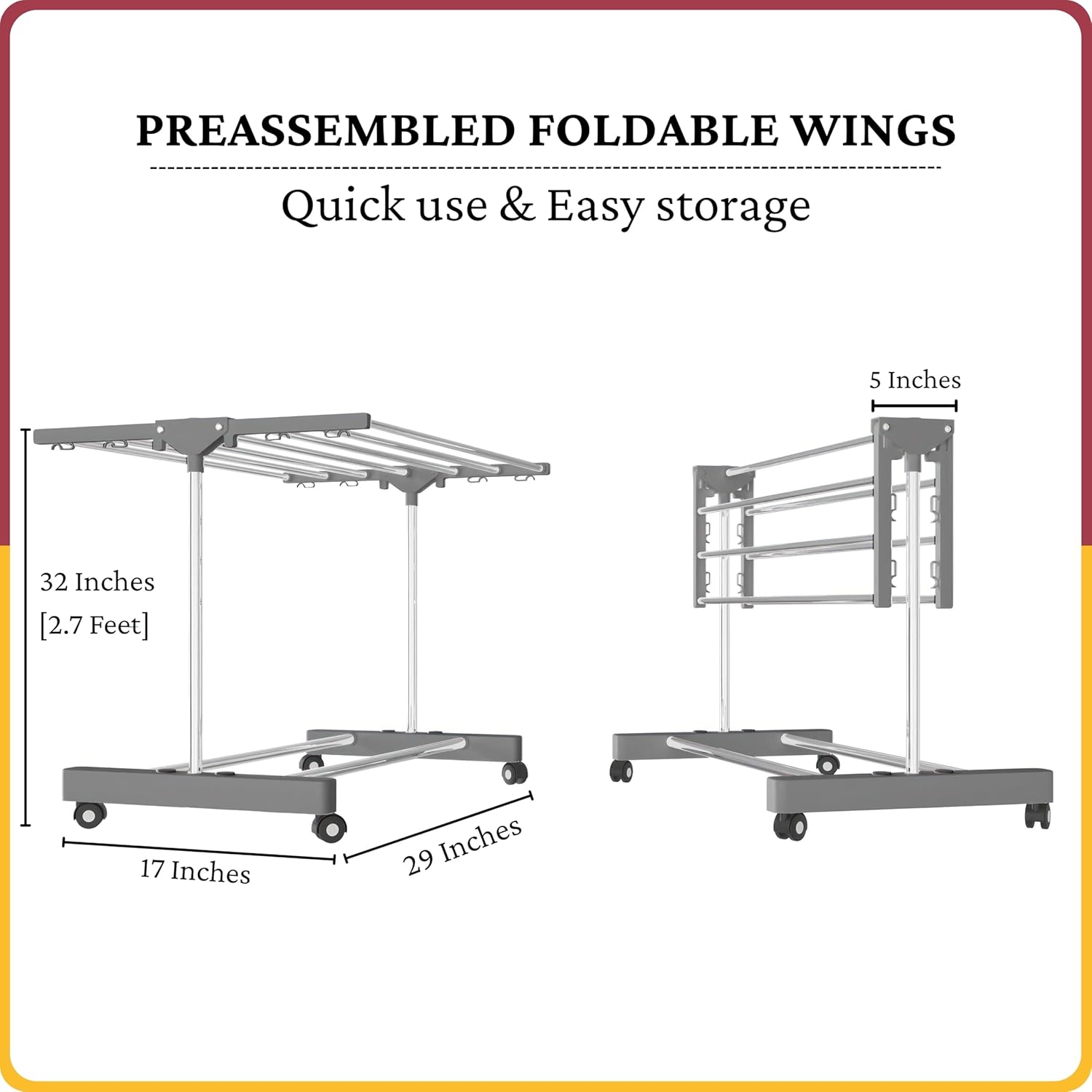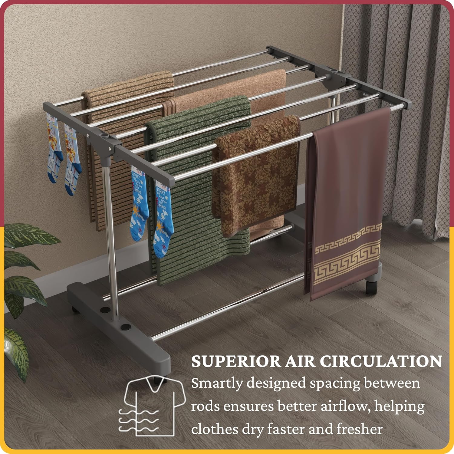 [360° Rotating Wheels]: The 360° rotating wheels ensure smooth, effortless movement, making it easy to move the drying stand wherever needed for convenient use around your home