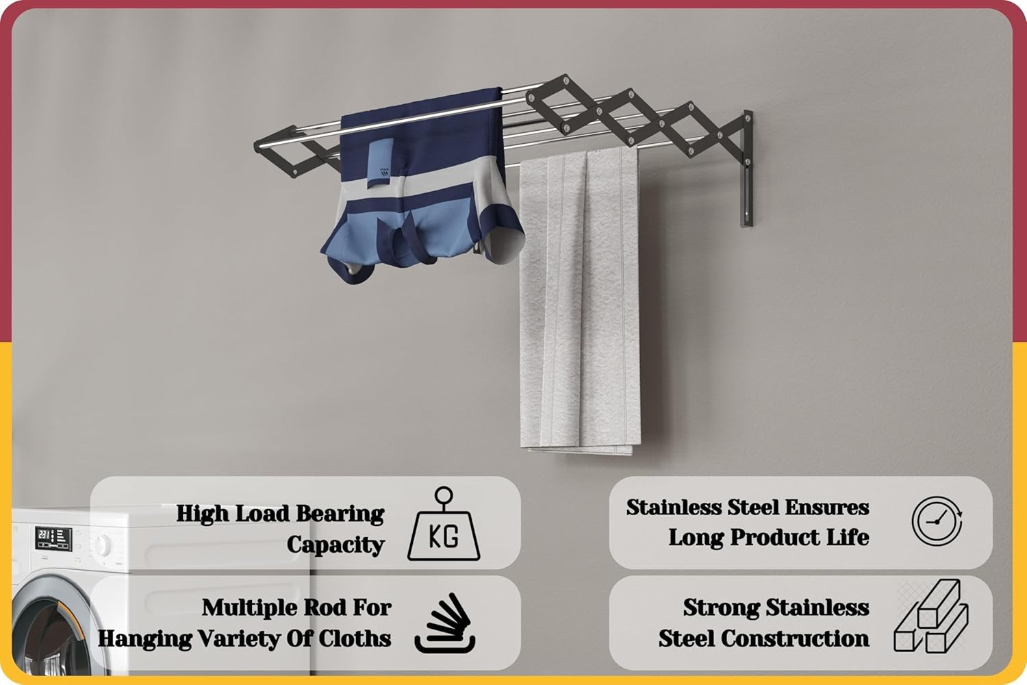 [Space-Saving Wall-Mounted Design]: This foldable drying rack opens when needed and folds flat against the wall when not in use, making it perfect for compact spaces like balconies, bathrooms, or small apartments.