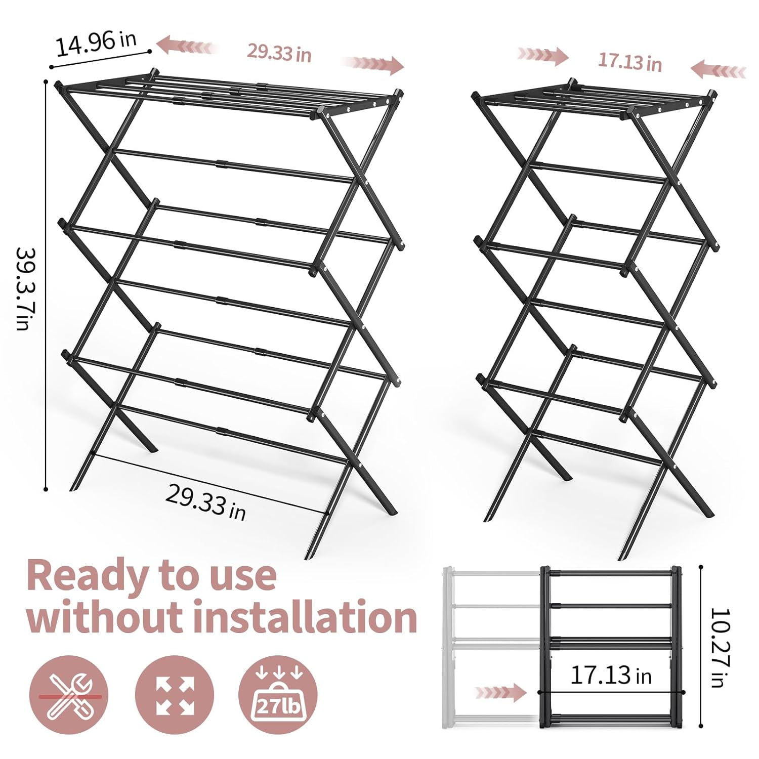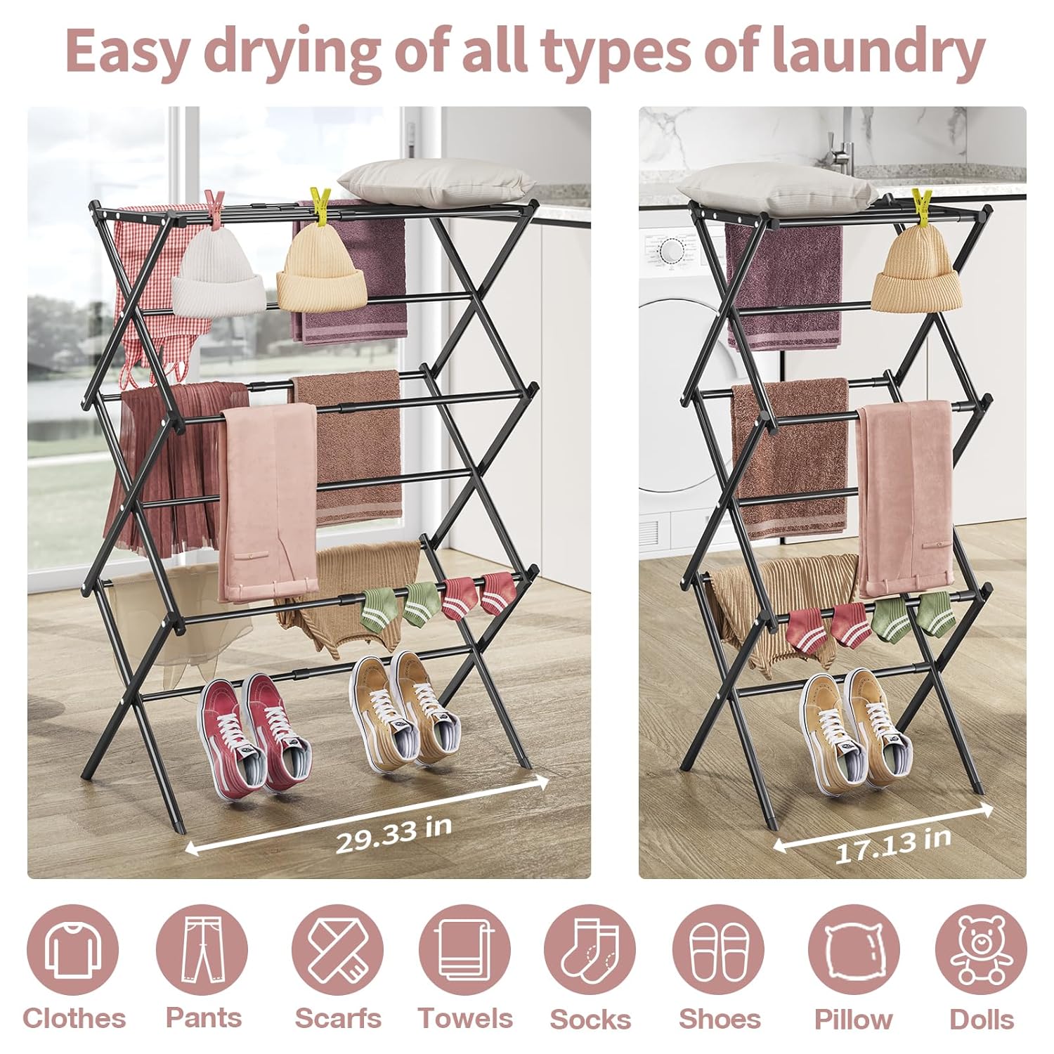 Expandable Design: The 3-tier laundry drying rack features 11 steel drying rods that can be extended from 17.13 to 29.33 iinches in length, providing ample drying space for towels, clothes, sweaters, and more.