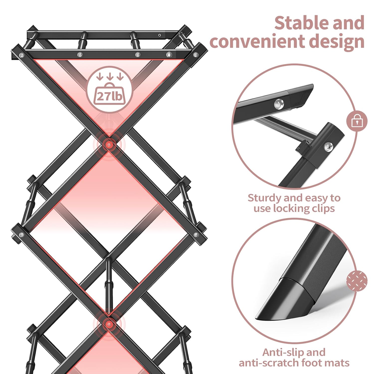 Lightweight Storage: This foldable drying stand for clothes comes with non-skid rubbers at the bottom that won’t scratch the floor. Its collapsible design allows for easy storage and transportation, making it perfect for use in the laundry room or on the patio, or for stashing away in a corner to save space.