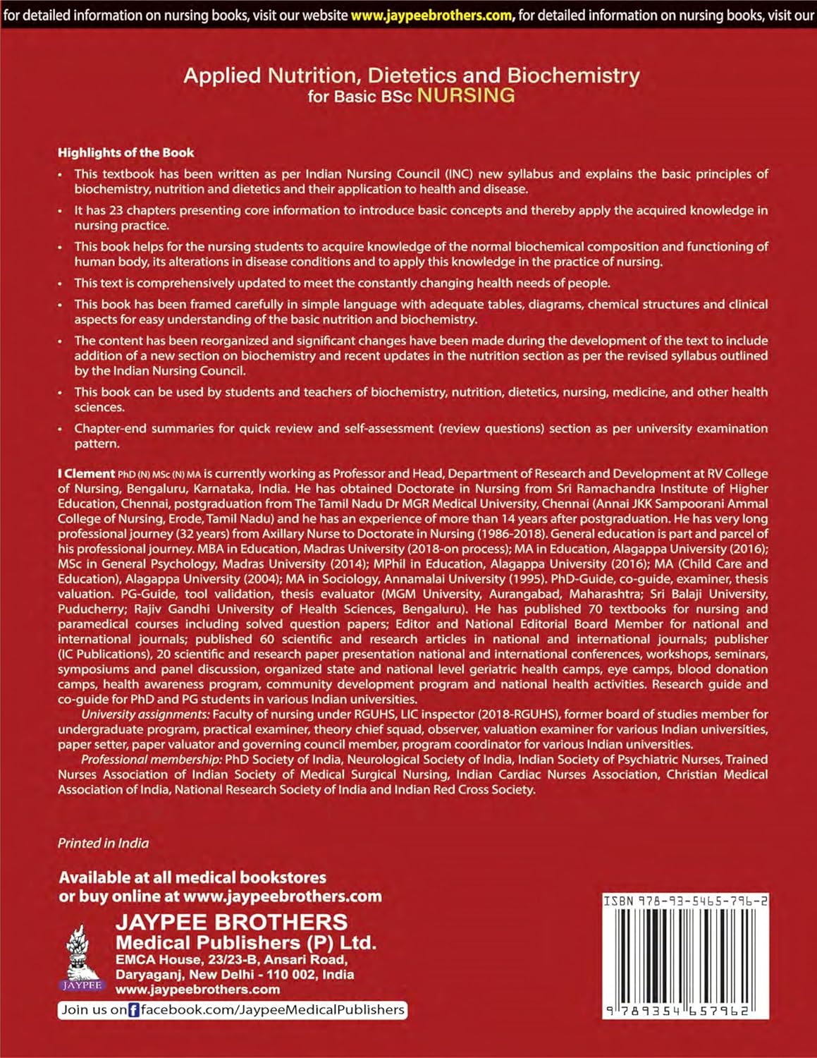Textbook on applied nutrition, dietetics and biochemistry for BSc Nursing students is written as per the New Indian Nursing Council (INC) Syllabus] has 23 chapters, 14 chapters framed for nutrition and dietetics, 9 chapters framed for biochemistry, prepared carefully in simple language with adequate tables, diagrams, chemical structures and clinical aspects for easy understanding of the basic nutrition and biochemistry.
