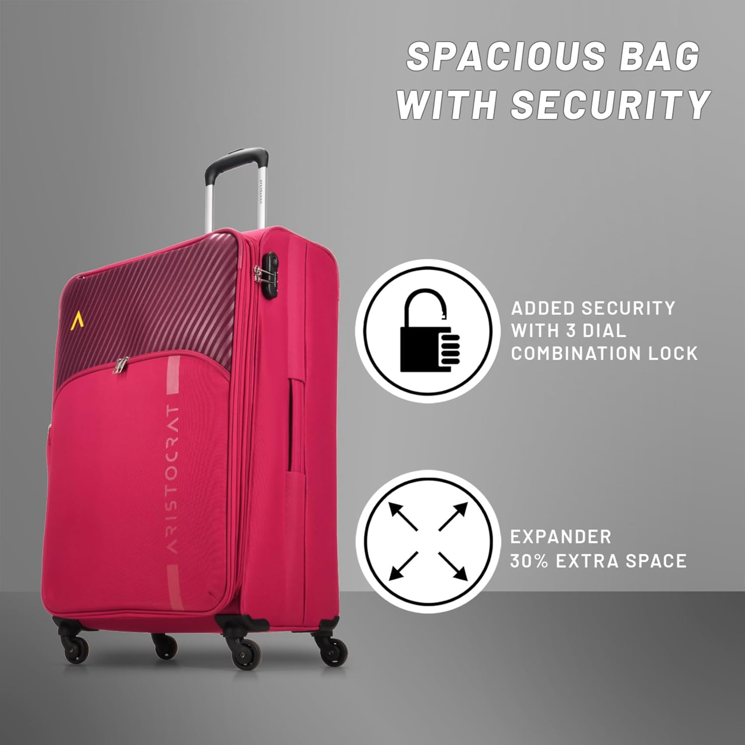Introducing the Aristrocrat Striker soft luggage strolley, an epitome of style and functionality. With its new design and molded print, this robustly constructed luggage offers generous space and an expander for extra room. Features include a combination lock, silent wheels, sturdy push trolley, corner guard, and kick guard. Travel with confidence and convenience.