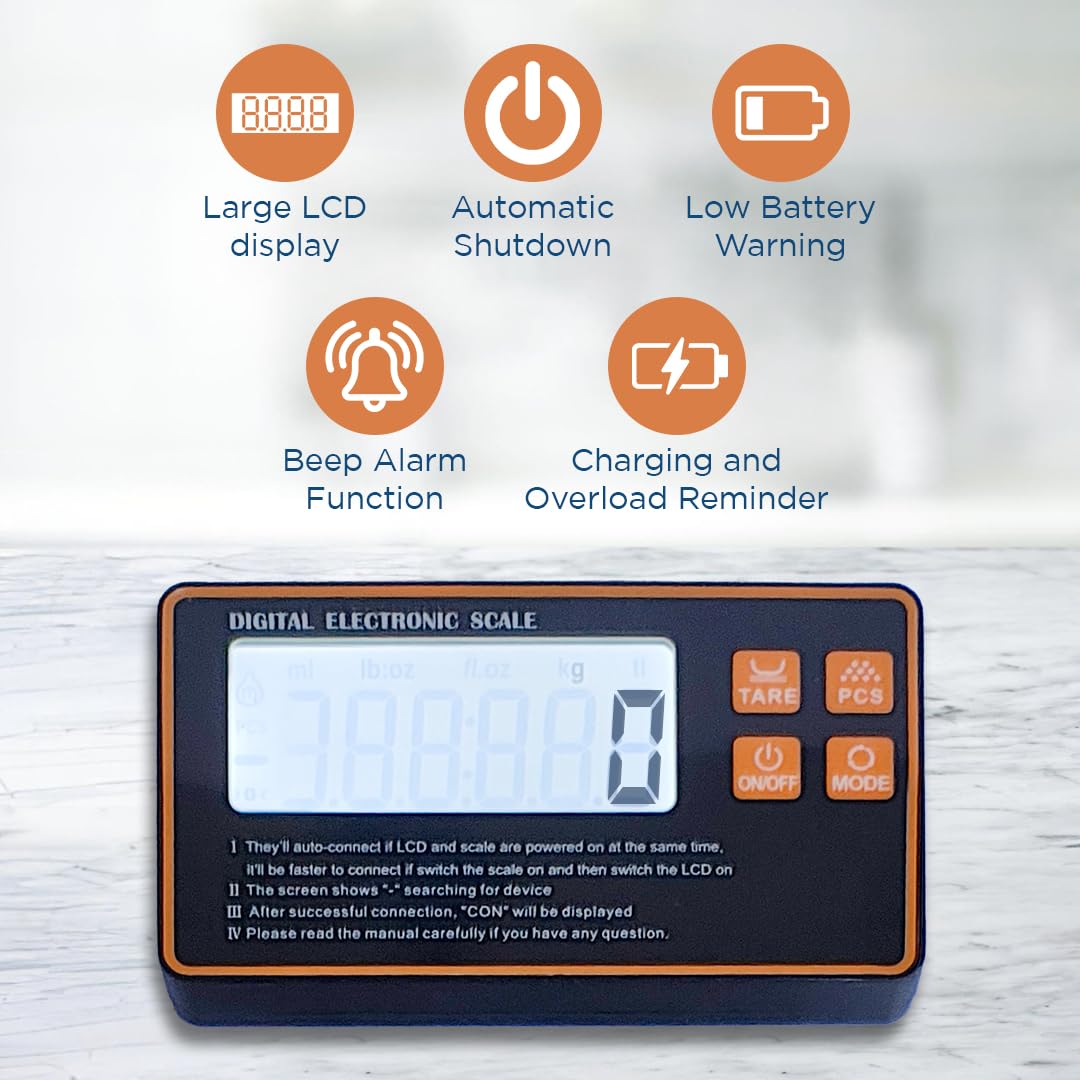 Introducing an innovative kitchen food scale with a wireless design that separates the weighing area and display.Say goodbye to obstructed readingsfrom oversized items or needing a larger scale for bulky ingredients. This wireless scale offers the ultimate convenience for weighing both small and large items, ensuring accurate measurements every time.Its compact and portable design makes it the perfect tool for any kitchen.