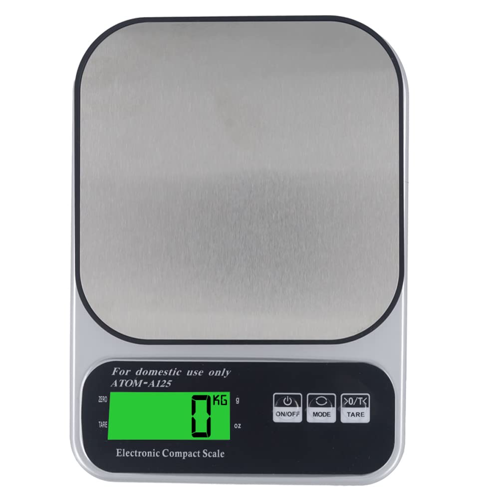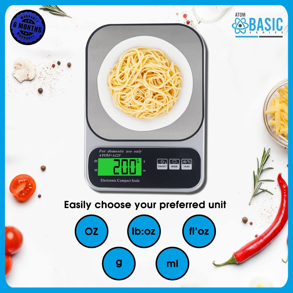 Atom Digital Kitchen Weighing Scale & Food Weight Machine for Health, 10kg X 1gm, Fitness, Home Baking & Cooking, Silver and Black. For Domestic Use Only | Atom A 125