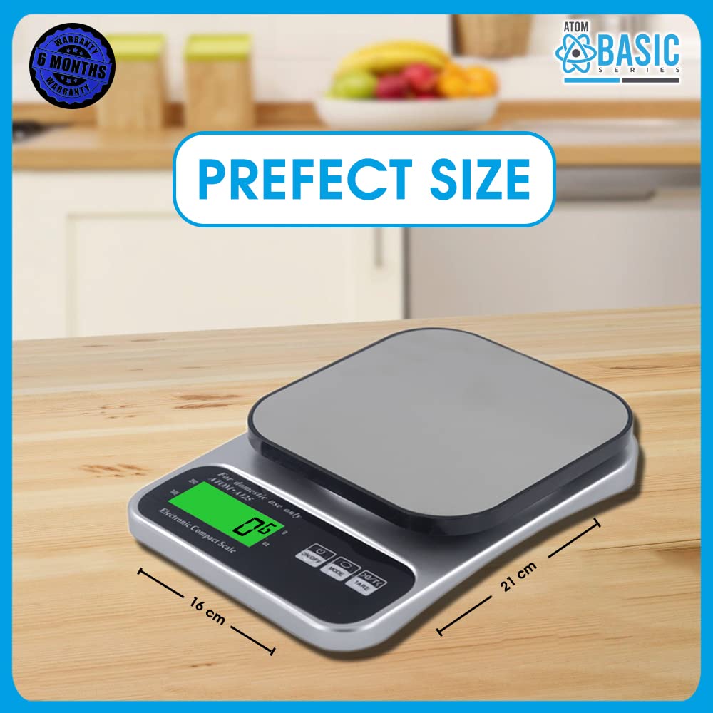 Home Scale Atom Digital Kitchen Weighing Scale & Food Weight Machine for Health, 10kg X 1gm, Fitness, Home Baking & Cooking, Silver and Black. For Domestic Use Only | Atom A 125