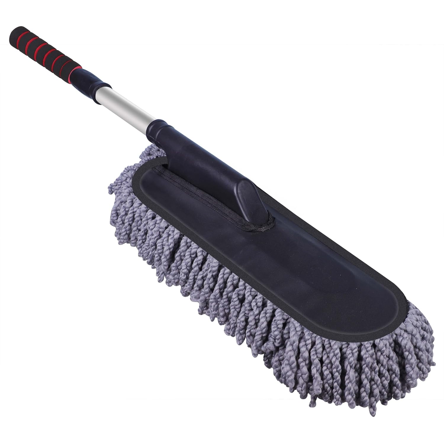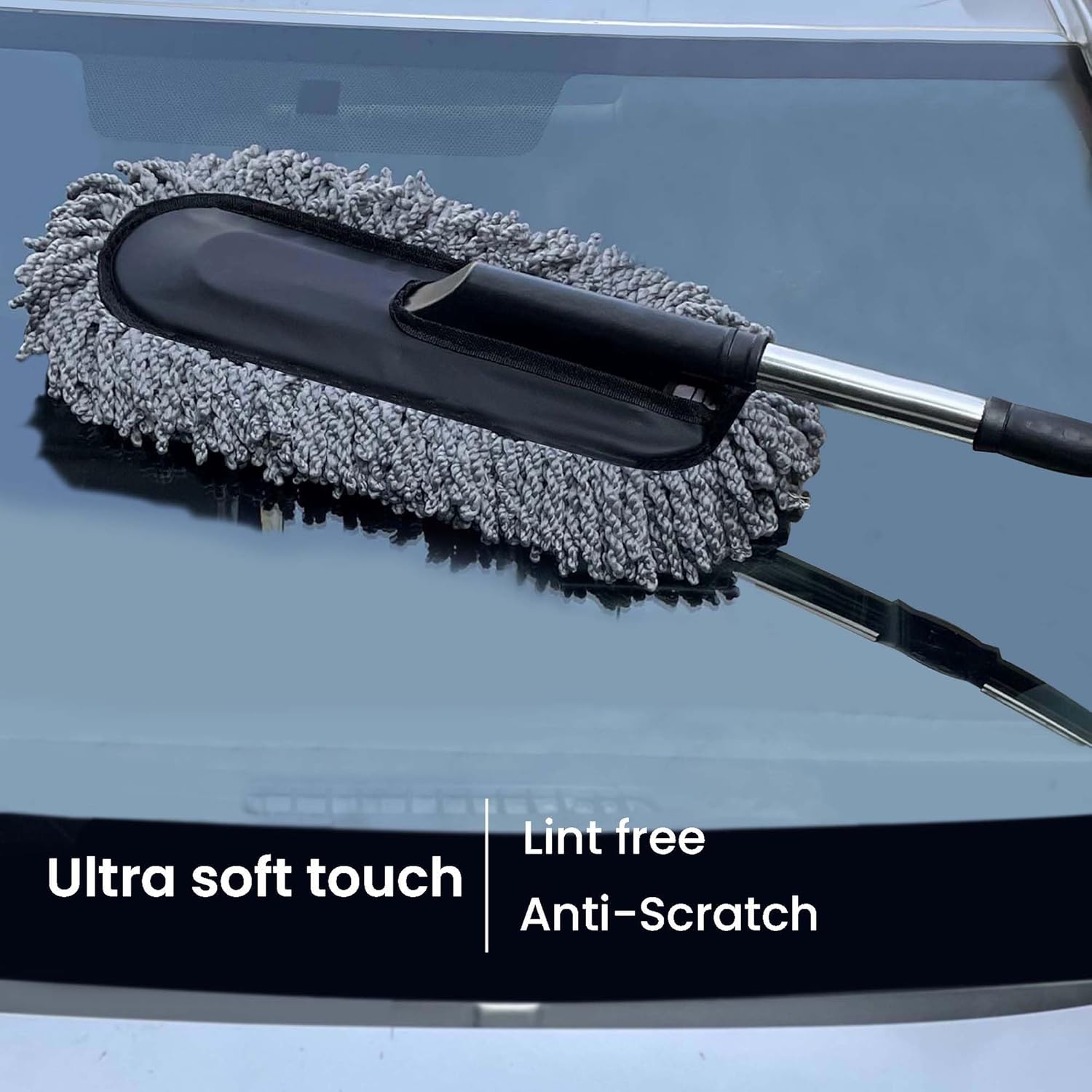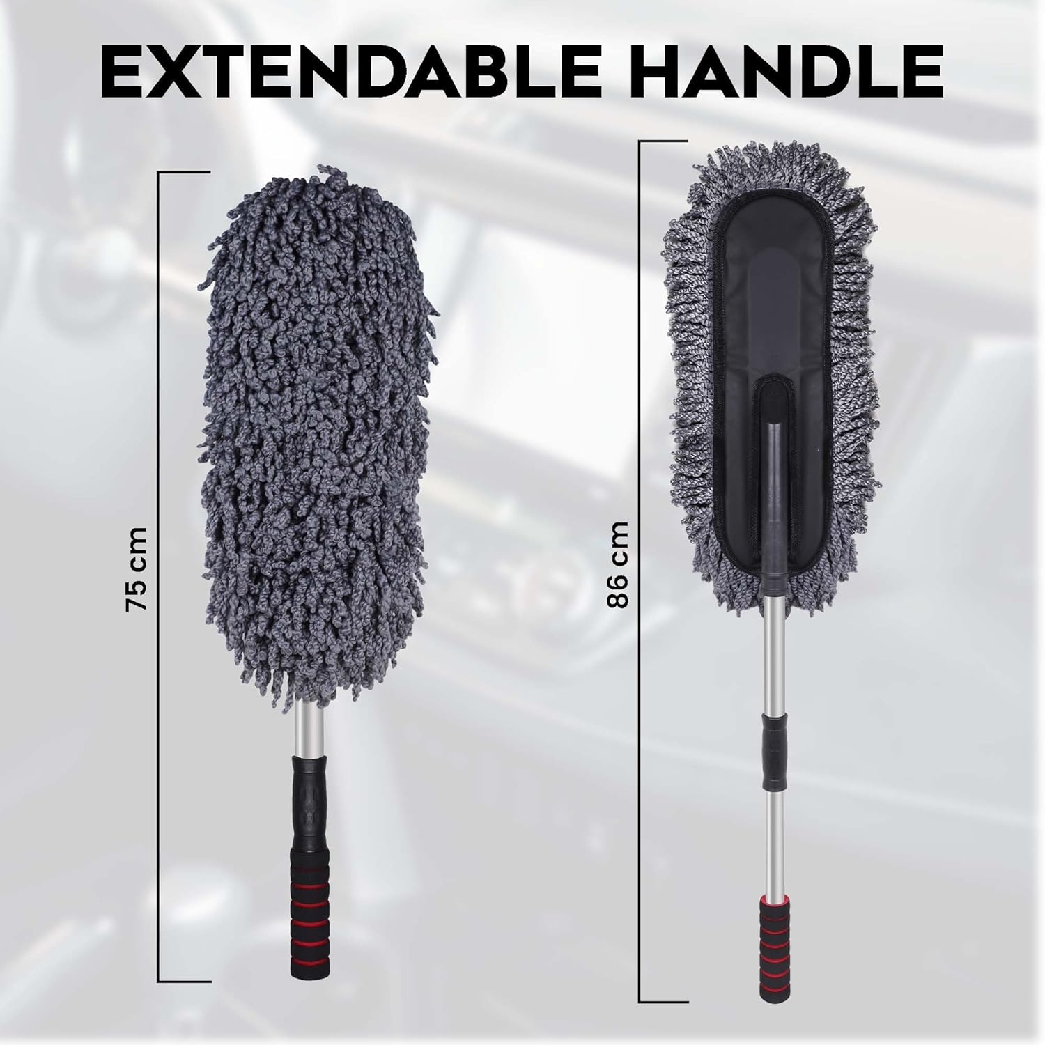 [FEATURES]- Washable; extendable telescopic handle to reach your car roof or room corners; dense microfiber for quick dust attraction & perfect wet cleaning; easy to store as it is portable.