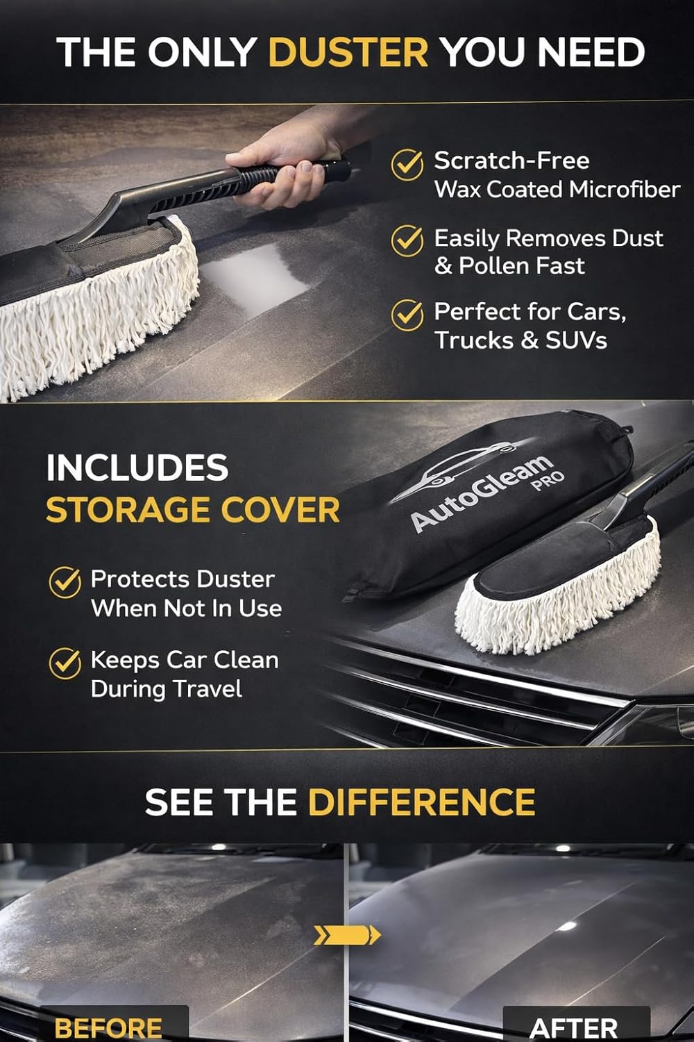 Unlike ordinary dusters, AutoGleam Pro uses wax-coated soft fibers that attract and trap dust effectively. Perfect for daily dusting in dry climates, city pollution, and dusty parking areas.