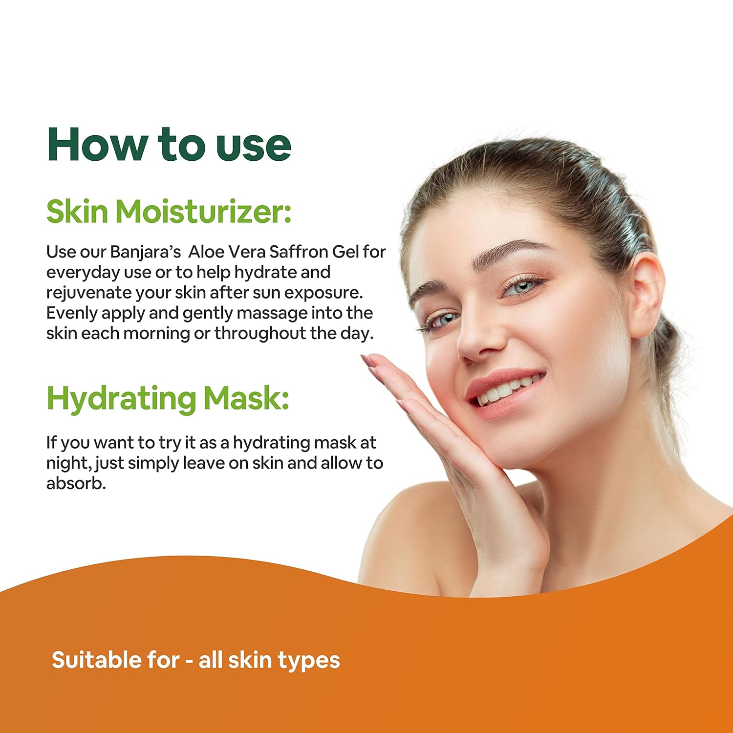 ALOE VERA CUCUMBER GEL : Cucumber is nature’s answer for healthy, glowing supple skin. Ancient beauty regimes swear by the cooling effects of cucumber, as it softens, brightens and whitens skin. Aloevera or Gritha Kumari, known for its regenerative, and restorative properties to make skin youthful and supple is a skin care staple. Aloevera gel infused with cucumber stimulates skin cell regeneration, hydrates the skin, and reduces blemishes and dark patches, giving radiant, bright and moisturized skin. ALOE VERA SAFFROn GEL : Saffron or Kumkuma, known in Ayurveda for its warm glow and part of many traditional beauty regimes, saffron adds lumniscience to the skin, evens out the skin tone, reduces spots and blemishes, making it radiant. When combines with aloevera in our unique formulation, Banjara’s Aloevera saffron gel will be your favorite goto, to all skin problems and a simple daily hydration routine.