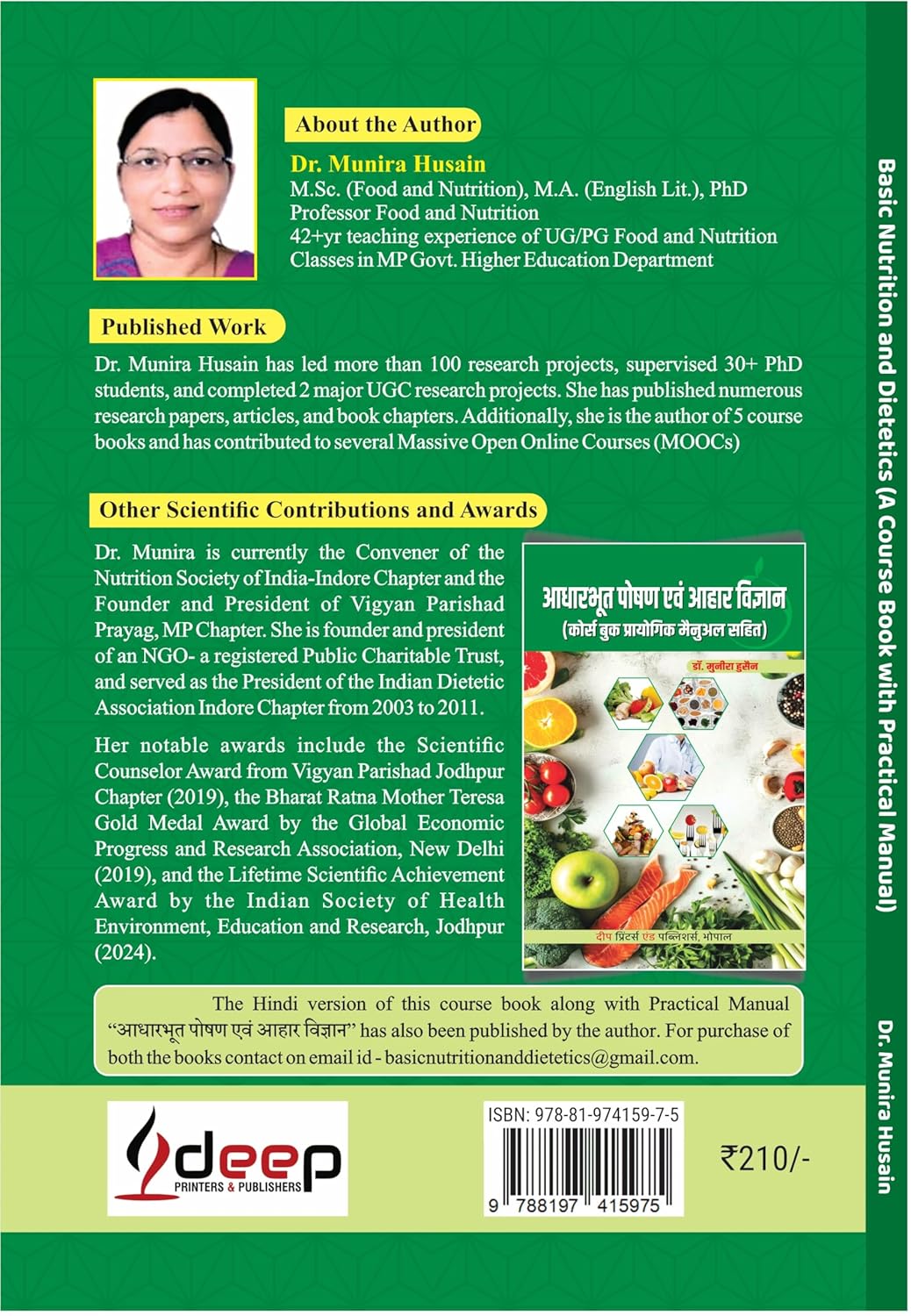 Basic Nutrition and Dietetics is a comprehensive guide that combines physiology, medicine, microbiology, pharmacology, chemistry, and biology to provide a deep understanding of health, food, nutrition, disease, and diet therapy. Authored by Dr. Munira Husain, with over 42 years of teaching experience in the MP Govt. Higher Education Department, this book is designed to meet the needs of students, educators, and professionals in the field of nutrition and dietetics. This book “Introduction to Nutrition and Dietetics” aims to provide a comprehensive literature on nutrition and dietetics, covering essential aspects of determining ideal diet and nutritional requirements for individuals and in family meal management. The book’s coverage of essential aspects of nutrition and dietetics will provide students with a solid foundation in the subject. The book has targeted for the Students from various disciplines who are interested in studying nutrition, the Students who have chosen Nutrition and Dietetics as a vocational course and the Faculty members who are teaching Nutrition and Dietetics in colleges and universities. The inclusion of a colorful Practical Manual is a unique 2 in 1 feature that will enable students and teachers to get an insight about how to perform practical related to identifying foods, food groups, measurement of ingredients, and preparing nutrition education tools.