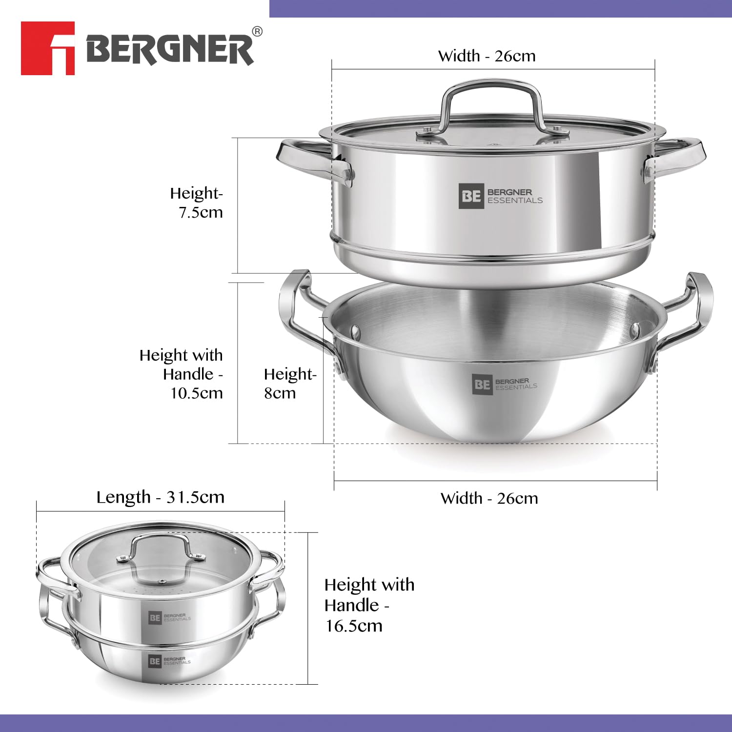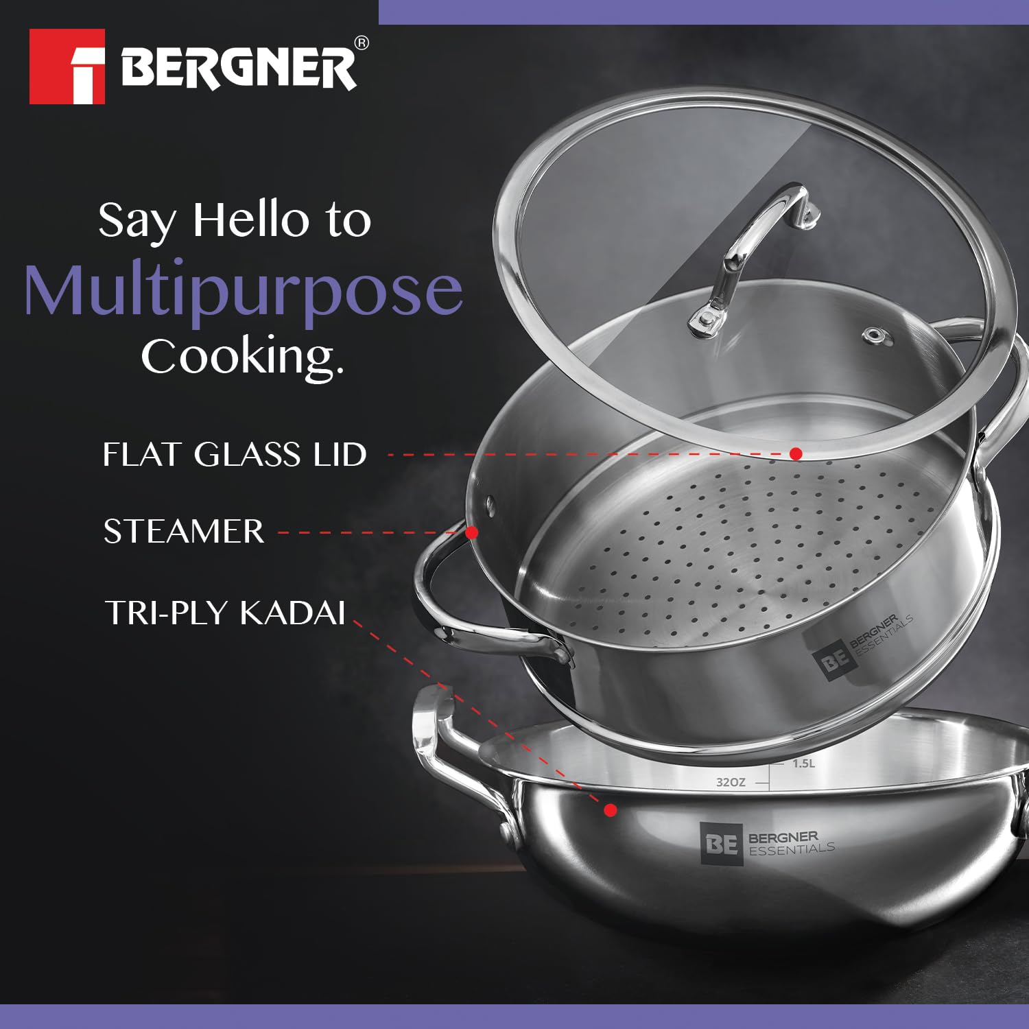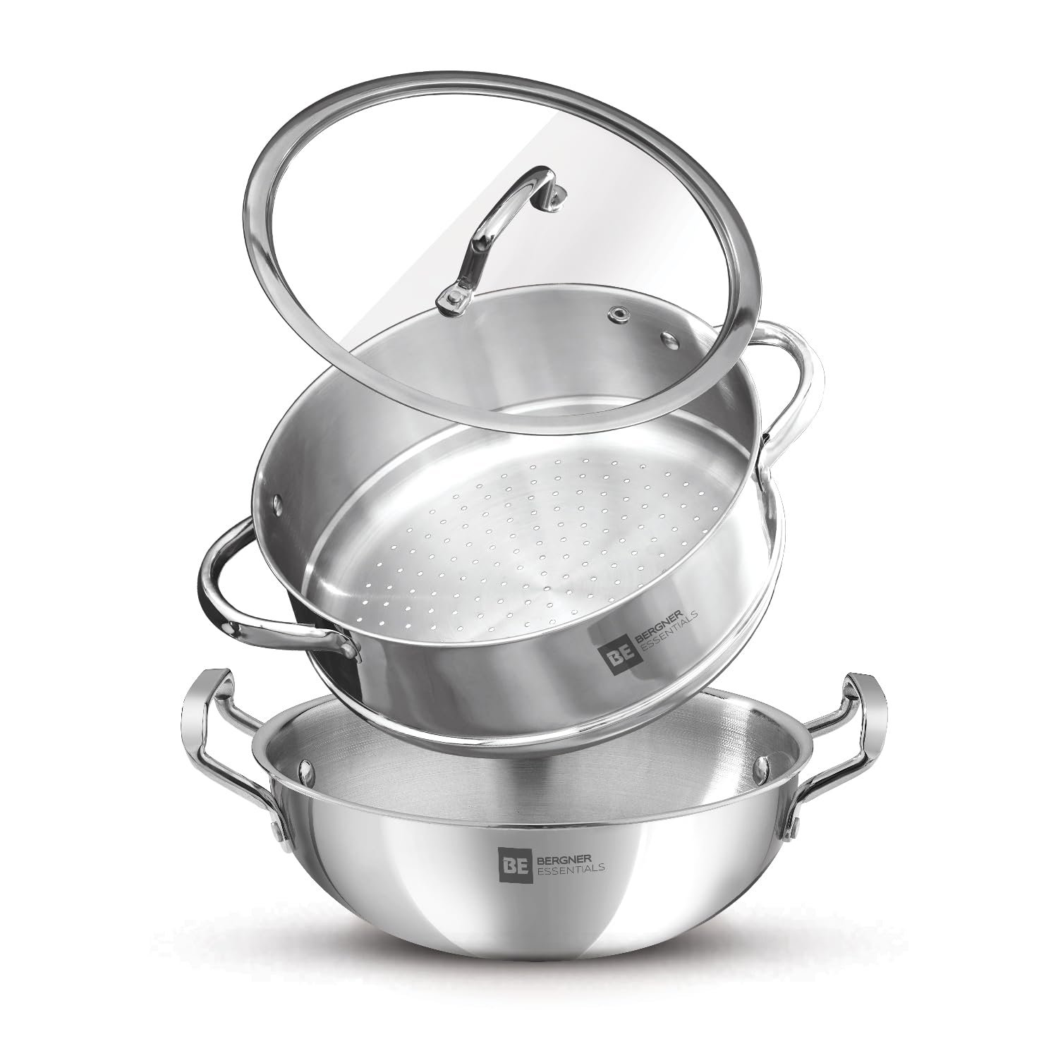 Home Accessories Bergner BE Essentials TriPly Stainless Steel 3 Pcs Cookware Set of 24cm Kadai (2.5 L) and Steamer with Common Flat Glass Lid, Kadhai and Steamer Set – Induction Bottom and Gas Stove Compatible