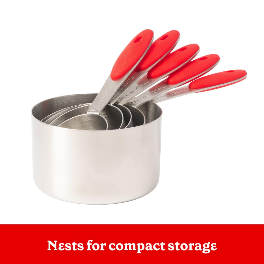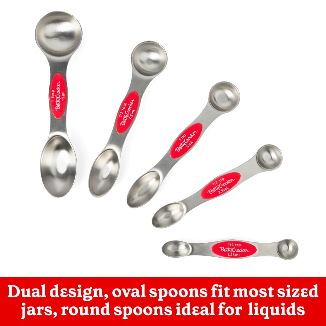 Betty Crocker Measuring Cooking Bundle includes a set of five measuring spoons and five measuring cups. The spoons have a dual design and magnetic snap for easy storage.