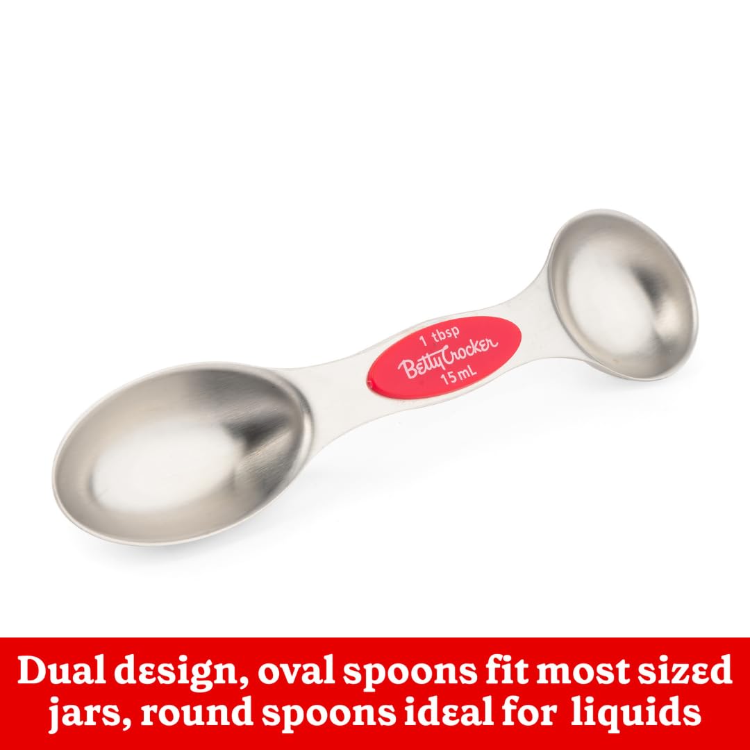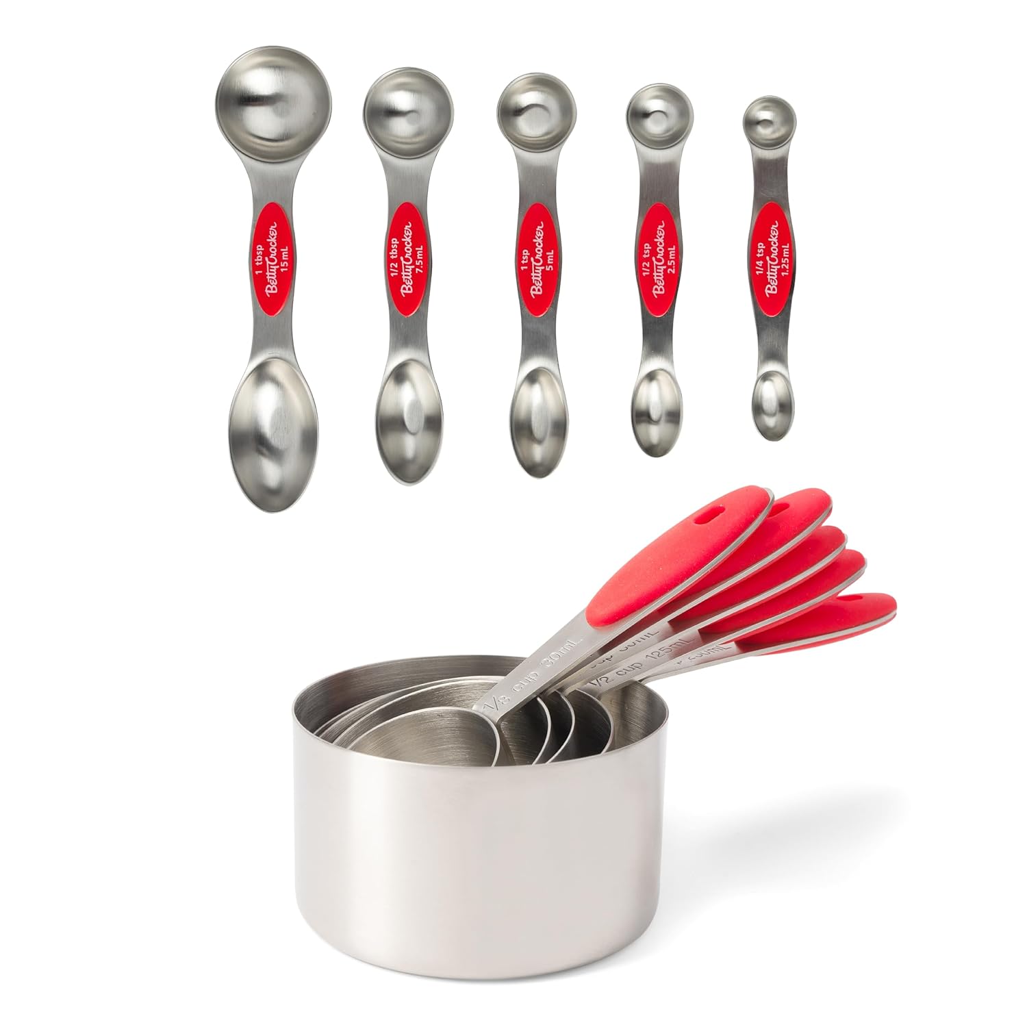 Home Accessories Betty Crocker Measuring Cooking Bundle includes a set of five measuring spoons and five measuring cups. The spoons have a dual design and magnetic snap for easy storage.