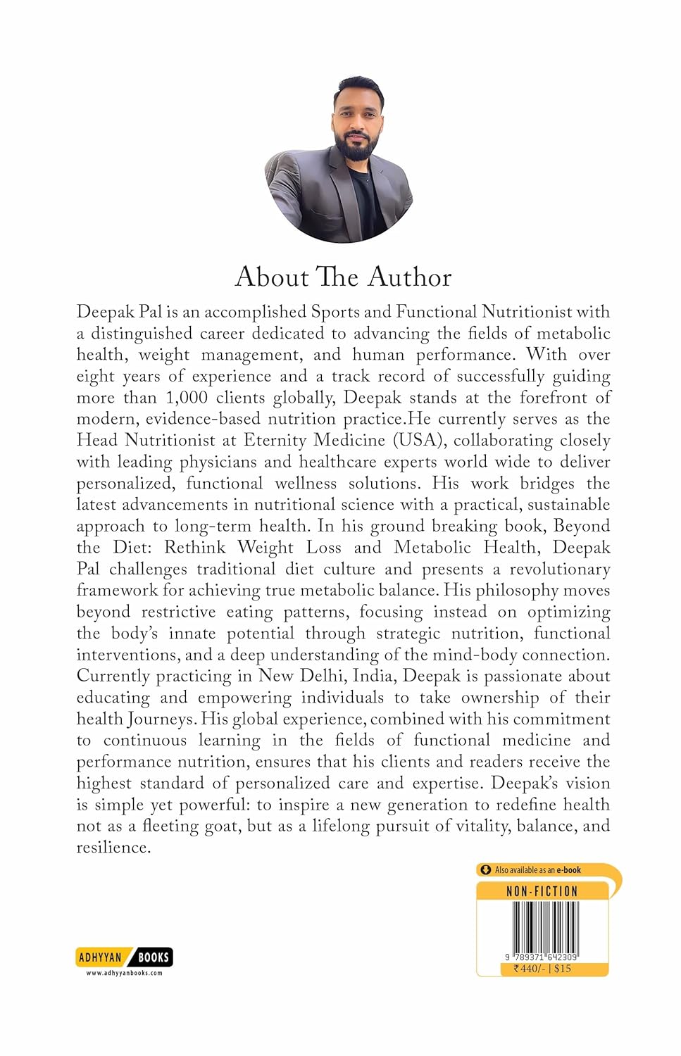 Beyond the Diet is a groundbreaking roadmap to lasting metabolic health that goes far deeper than calorie counting or restrictive eating. In this integrative guide, Deepak Pal—renowned functional and sports nutritionist—challenges the conventional weight loss narrative and introduces a powerful, 360-degree framework rooted in science and personalized wellness. The book explores the eight core pillars that influence metabolic balance and long-term health: Inflammation Control: Learn how chronic inflammation silently drives weight gain and disease—and how to switch off the fire through lifestyle and nutrition. Correct Nutrition: Move beyond fads to discover nutrient-dense, sustainable eating patterns that nourish your metabolism and support hormone function. Toxin Reduction: Uncover how hidden environmental toxins disrupt your health and discover simple detox strategies to lighten your toxic load. Gut Health: Heal your gut to heal your metabolism. Understand the gut–brain–immune axis and its critical role in digestion, immunity, and weight. Hormone Regulation: Decode the powerful effects of insulin, cortisol, thyroid, and sex hormones—and how to bring them back into balance naturally. Adequate Supplementation: Explore targeted, evidence-based supplements that fill nutritional gaps, support energy, and restore internal harmony. Mindfulness: Recognize how stress, emotions, and mental habits shape your body—and learn mindful techniques to restore inner balance. Exercise and Sleep: Master the rhythm of rest and movement to reset your biological clock and enhance metabolic flexibility. Through practical advice, real-life examples, and action-oriented steps, Beyond the Diet empowers readers to reclaim their health from the inside out. This is not just a book—it’s a metabolic revolution. It’s time to stop chasing diets and start building a lifestyle that truly works.