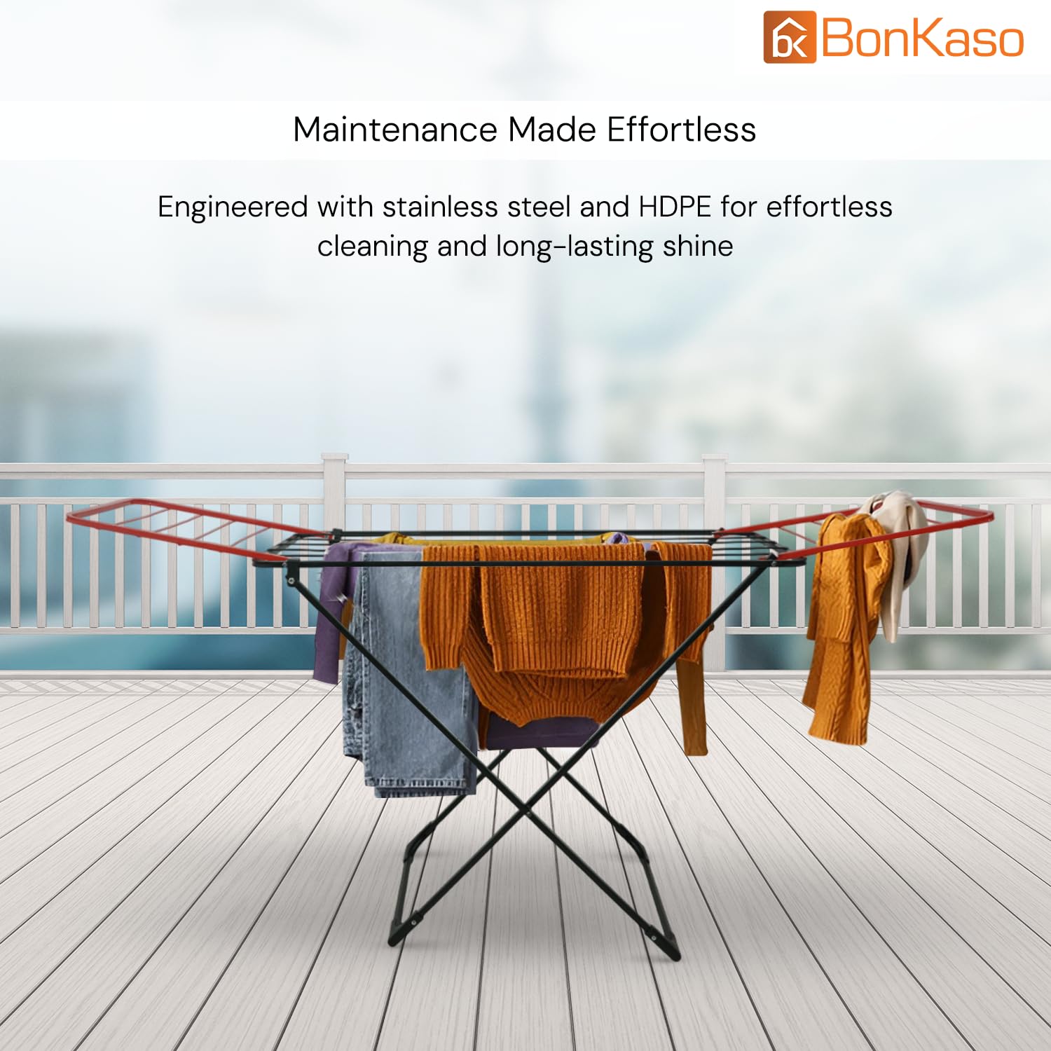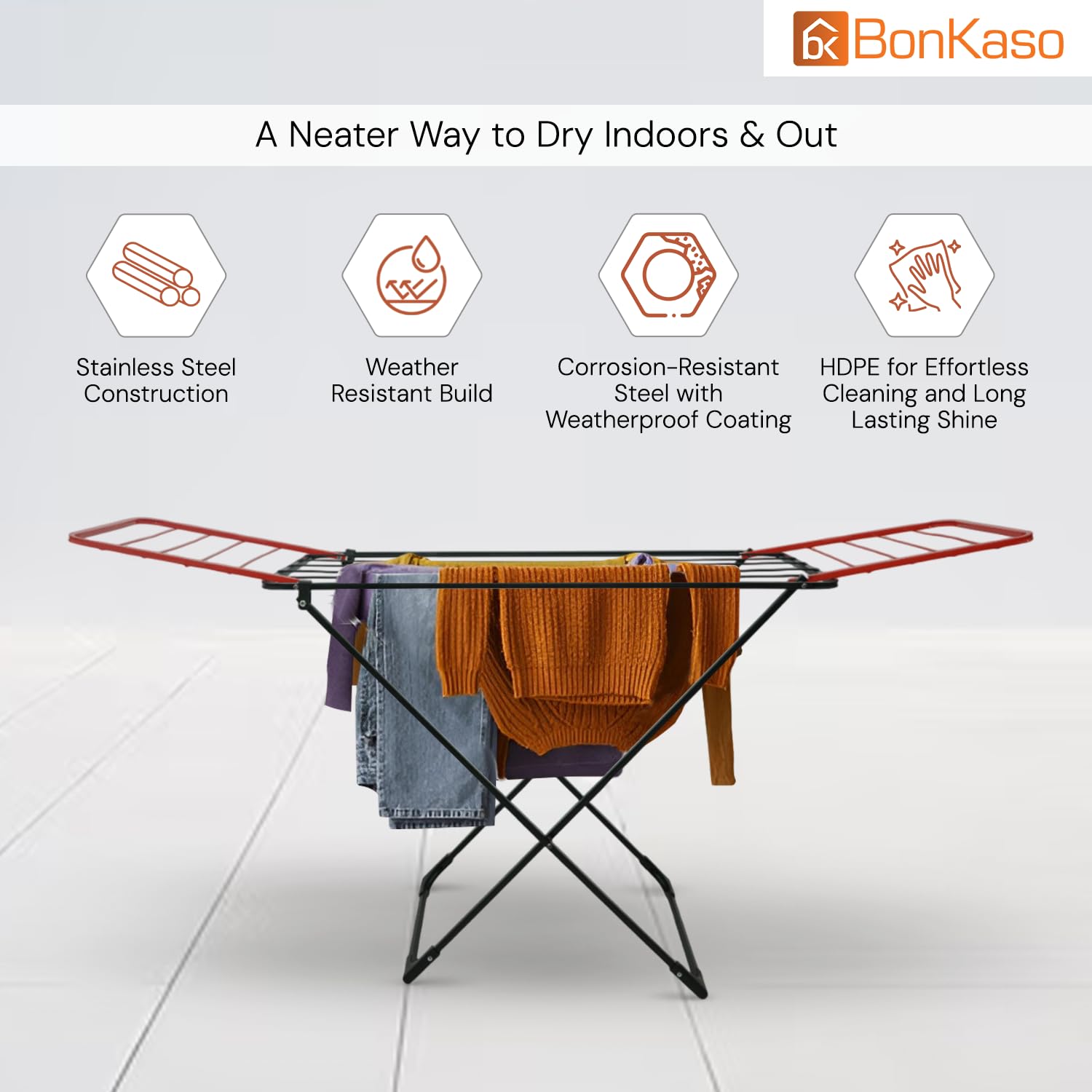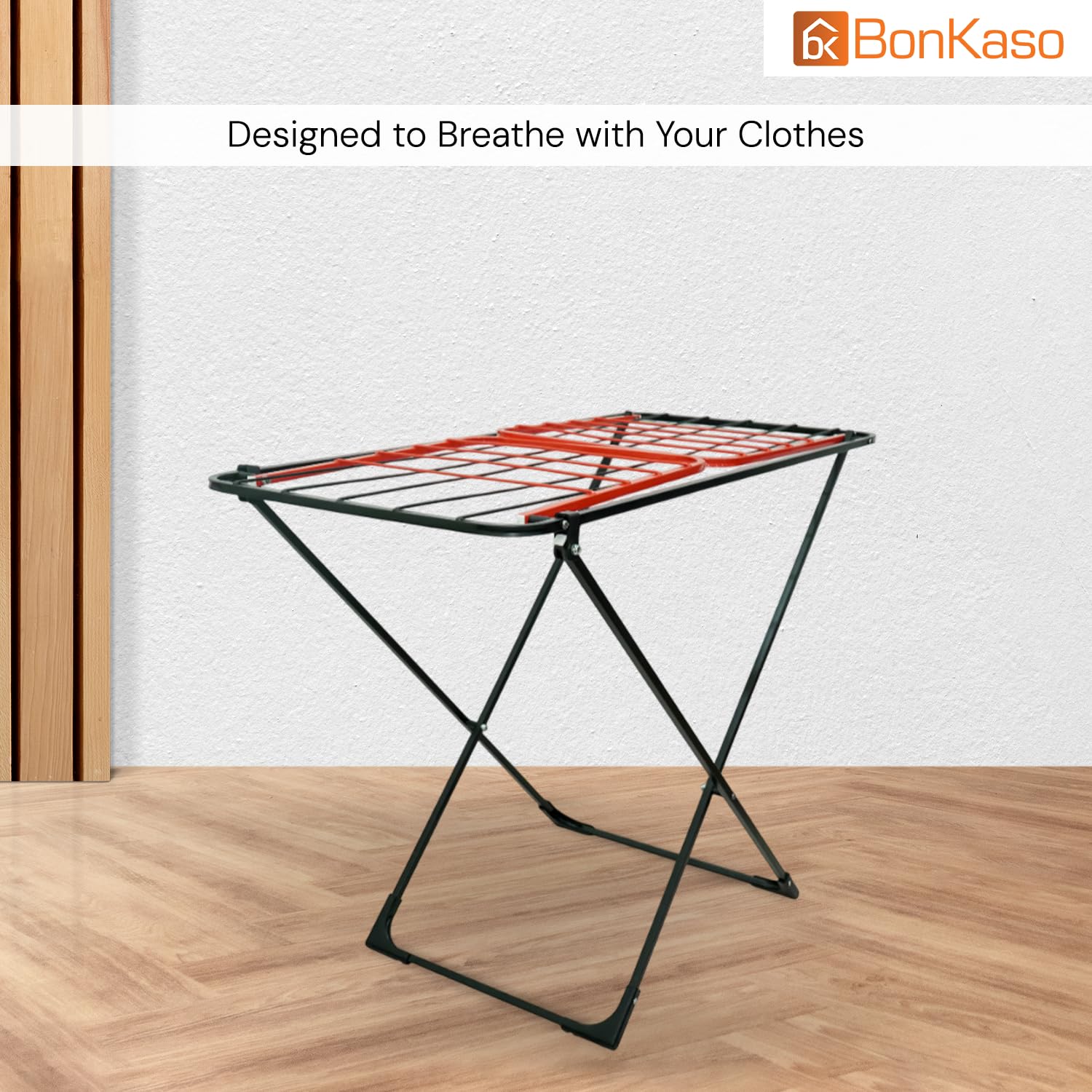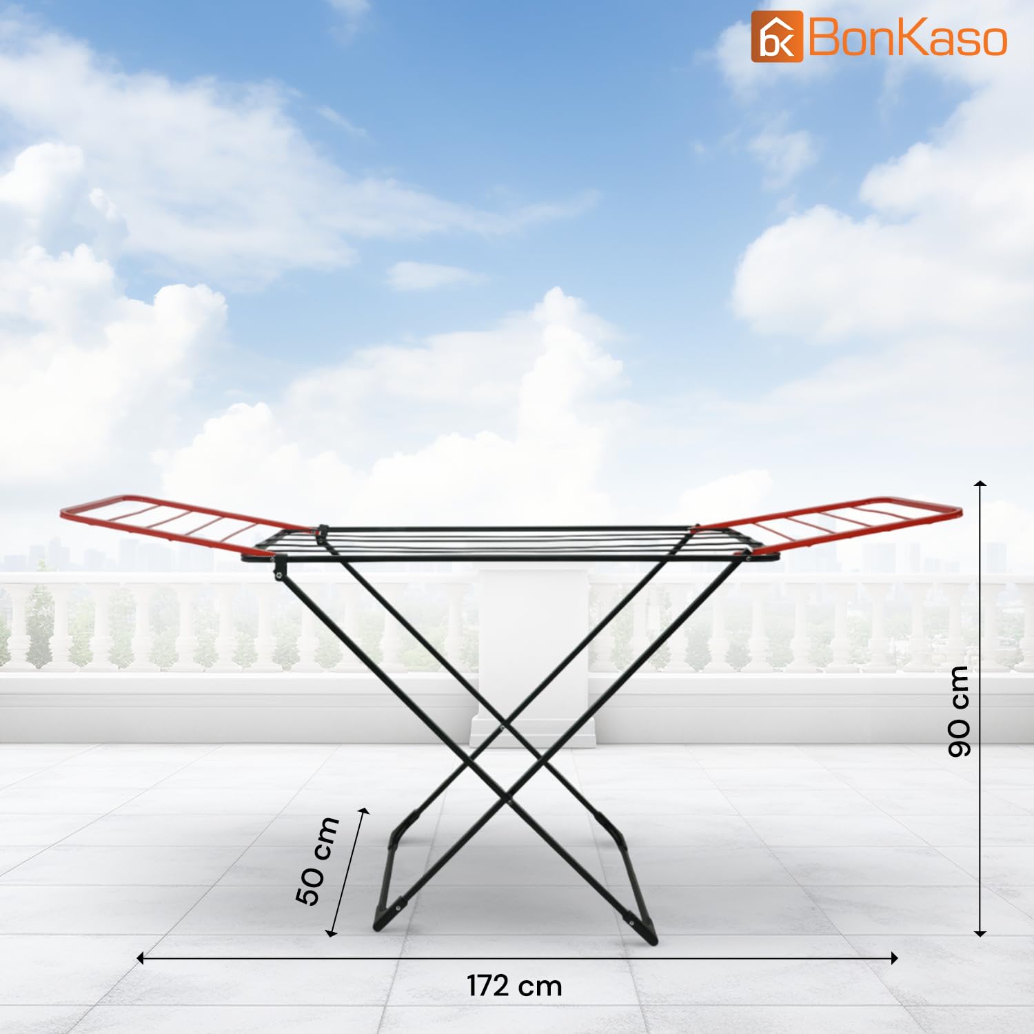 BonKaso Foldable Cloth Drying Stand for Clothes, 3-Way Folding with 17 Drying Rails, Lightweight Alloy Steel,Flat Folding Design | Indoor & Outdoor Clothes Dryer (50L x 172W x 90H) Black & Orange