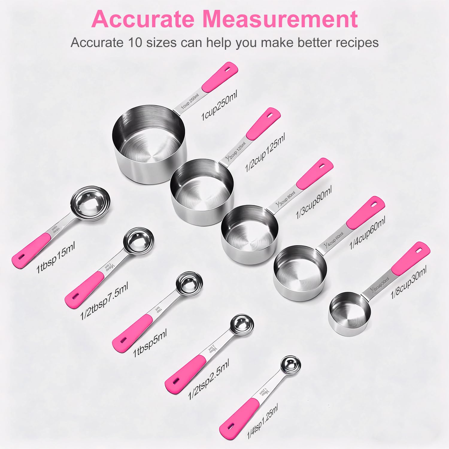 Bopei Measuring Cups and Spoons Set, Stainless Steel 10 Piece for Cooking and Baking (5 Cups + 5 Spoons, Pink Handle)