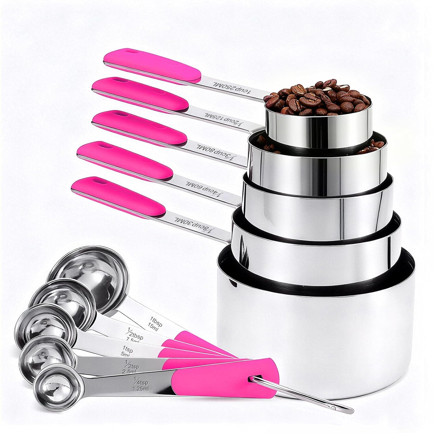 Complete Set – Includes 5 measuring cups (1 Cup, 1/2 Cup, 1/3 Cup, 1/4 Cup, 1/8 Cup) and 5 measuring spoons (1 TBSP, 1/2 TBSP, 1 TSP, 1/2 TSP, 1/4 TSP).