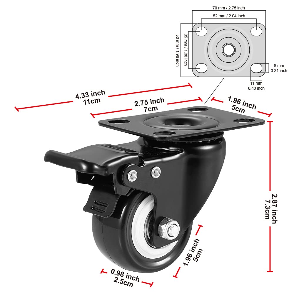 BOSGEOT 2″ Caster Wheels, Heavy Duty Casters with Brake Set of 4, Locking Casters with 360 Degree No Noise Polyurethane (PU) Wheels, Swivel Plate Castors Pack of 4