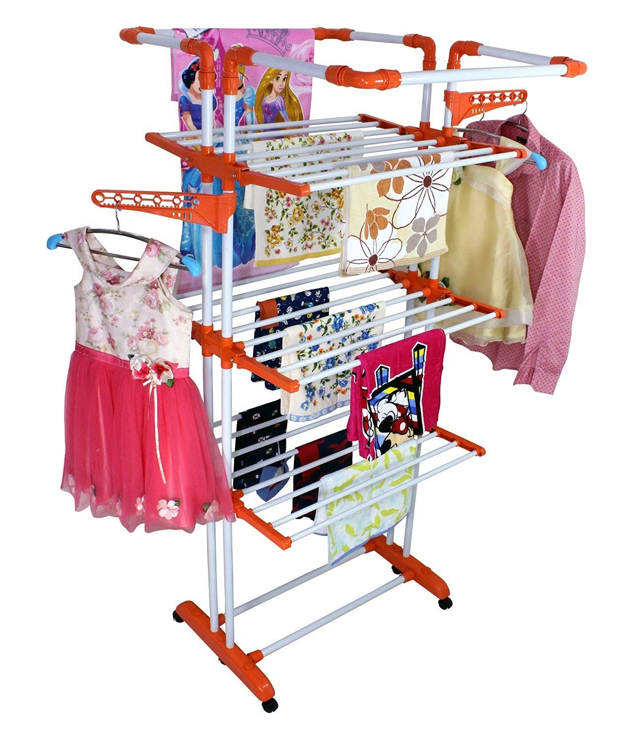 Material: Steel,Color: Orange or BluePackage Contents: 1 Drying RackSize: 80 cm x 37 cm x 18 cmCloth dryer, ideal for every house, can hold a large number of clothes multiple rods to accommodate daily utility wash loadFoldable hanging frames different combinations. Fold the middle frame if you need to dry a bedsheet on the top frame as it requires more space for hangingWheels at the bottom for moving the rack convenientlyHigh-quality and durable steel rails can take weight of heavy wet cloths use them to hang clothes hangers with shirts, trousers and more