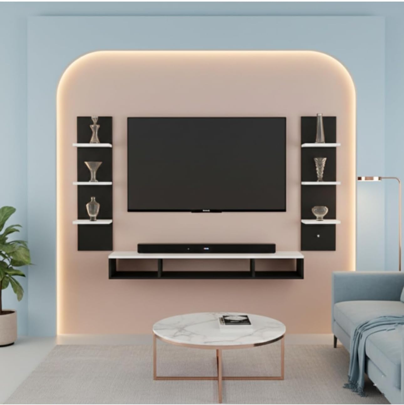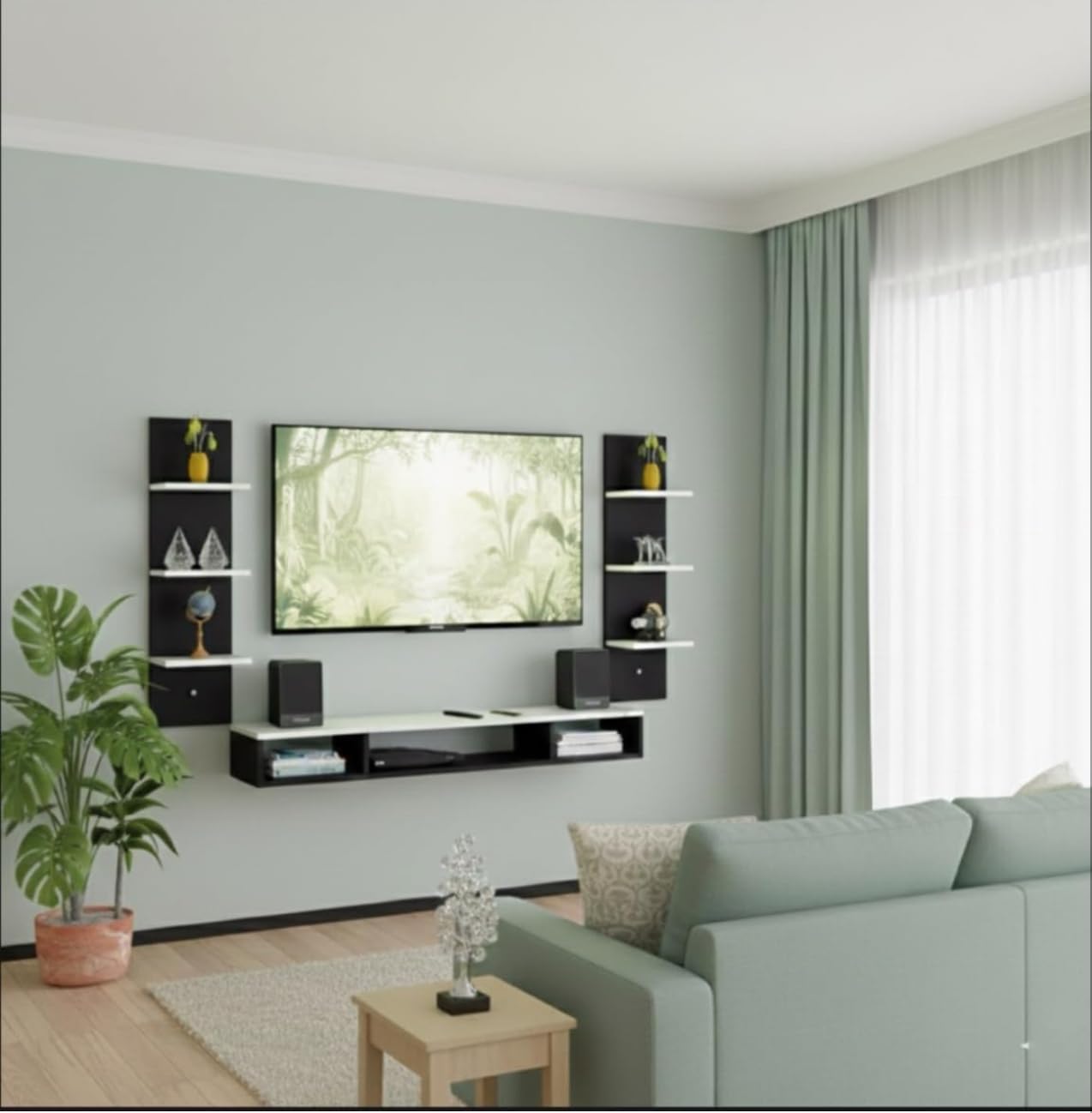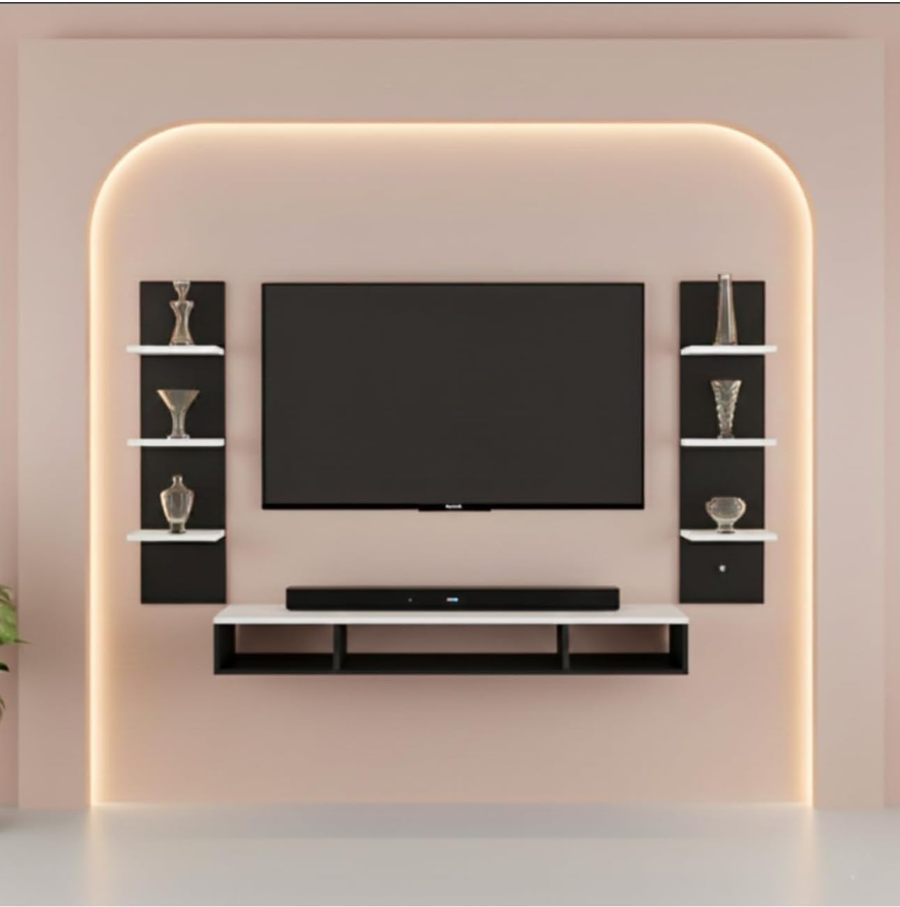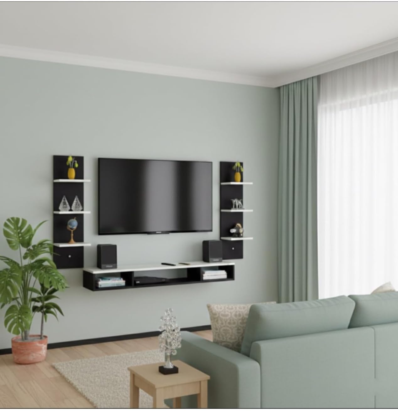 BrosMoon TV Unit is our team exclusive creation and perfect design for your TV. Dual tone finish in warm black & White will add beautiful to your home interiors. With flat utility shelves and compartments it offers loads of storage space to create a cozy home for your entertainment devices such as Set top Box, Video Players, Gaming Boxes, Remotes as well as Books, favorite photo frames or antique display items. It is a DIY (Do-It-Yourself) product, which means you’ll have to install it yourself or arrange a carpenter (at your own cost) to install it for you. It comes with the necessary hardware including a detailed installation guide. We’d recommend hiring an experienced, professional for installation. However, if you’re confident with intermediate DIY tasks, you could save time and money by installing it yourself. Product Dimensions after installation : Length (100Cm ) Width (20Cm ) Height (100Cm) Material:Made of Particle Board (High grade engineering wood with natural wood grain finish) SPACE SAVING – Large Countertops Ensure Ample Storage Space. Wall-Mount Design Doesn’t Take Much Space and Frees Up Valuable Floor Space. The Middle Compartment is Intended to Keep Your Set-Top Box While Books, Decorative Items & 4 Fully Functional Floating Open Shelves for Organize and Display Your Decorative Objects. The console has cable holes designed for hiding messy cables. Keep your stuff neatly organized make the living space more beautiful. Crafted from engineered wood