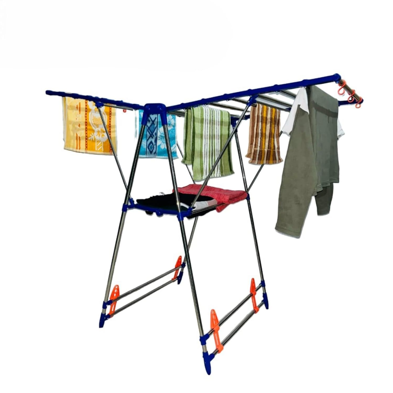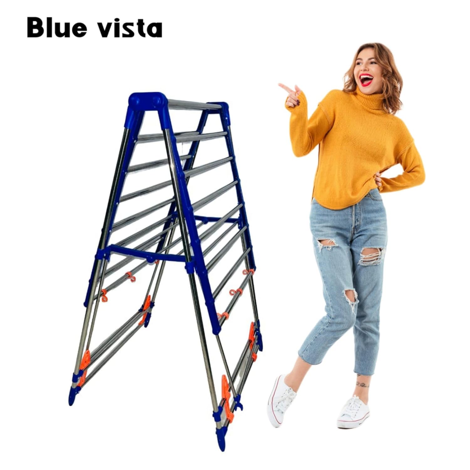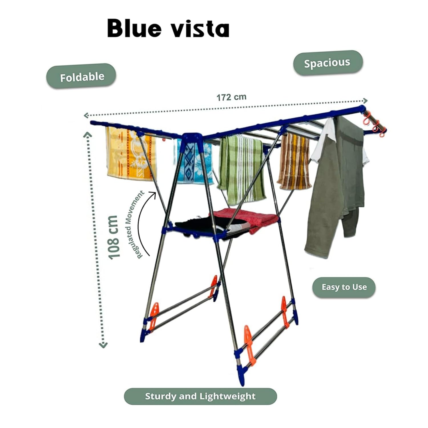 RIOMAX Premium 3 Layer Foldable Clothes Drying Stand with 16 Rods & 8 Additional Hooks, Heavy Duty Stainless Steel Cloth Dryer for Indoor/Outdoor/Balcony Use (Material- SS, Silver & Blue, Pack of 1)