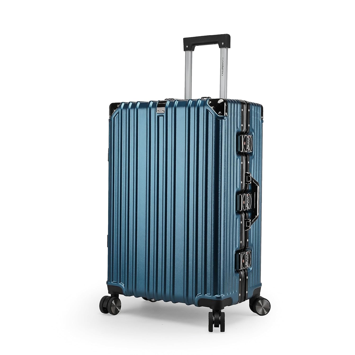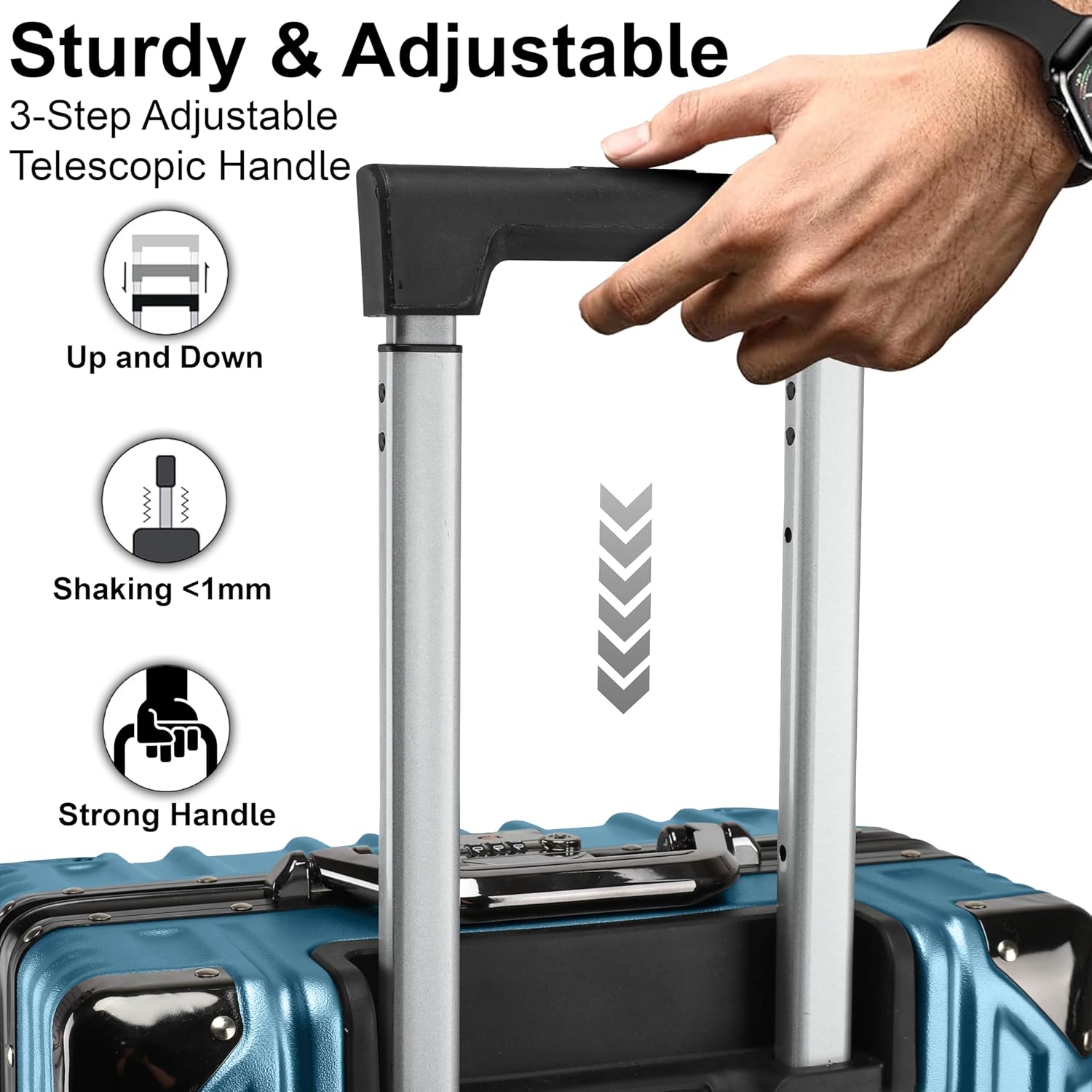 - Our luggage with spinner wheel has the multi stage telescopic iron trolley handle with cap.