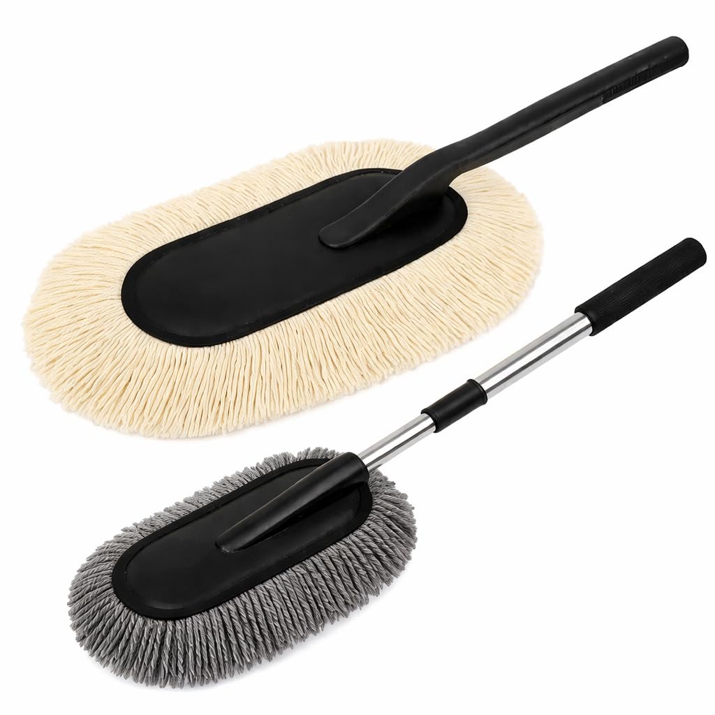 2-PIECE CAR DUSTER SET: Includes one beige cotton duster with fixed handle and one grey microfibre duster with extendable telescopic handle for versatile cleaning options
