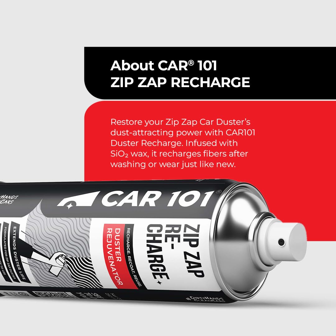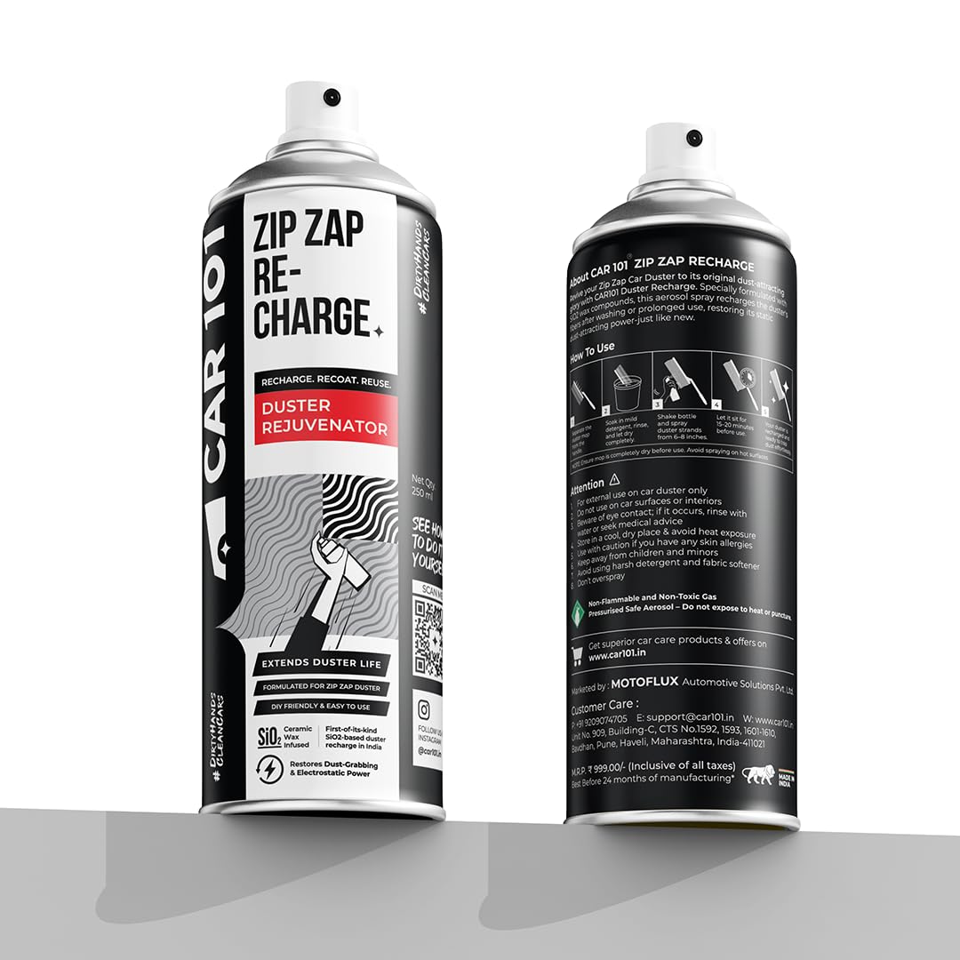 Bring back your duster’s original cleaning power with CAR101 Zip Zap Recharge – Duster Rejuvenator Spray, the ultimate solution to restore and maintain your duster’s dust-attracting performance effortlessly. Formulated with advanced Ceramic Wax Infused, it recharges your duster’s static properties, ensuring it continues to lift and trap dust, dirt, and pollen with ease, delivering a streak-free finish every time.Its easy spray application makes rejuvenating your duster quick and mess-free. Simply spray onto a clean, dry duster and let it dry before use – no complicated steps, no waiting, and no downtime. Ideal for use after every wash or whenever your duster’s performance decreases, this rejuvenator spray extends your duster’s life, saving you money by reducing the need for replacements.Perfectly designed for CAR101 Zip Zap dusters yet compatible with other wax-infused or microfiber dusters, Zip Zap Recharge ensures your cleaning tools remain effective, providing professional-grade dust removal for cars, bikes, scooters, and home surfaces with unmatched ease and convenience.