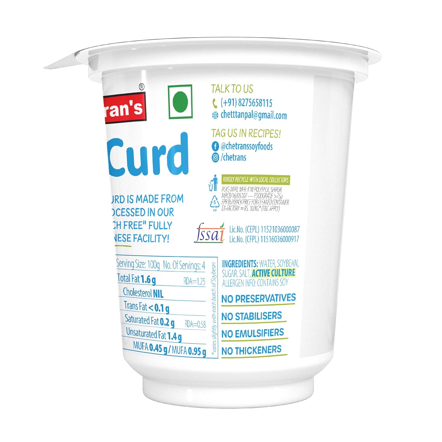 Chetrans Soya Curd is a delicious vegan(plant based) alternative to Dairy Curd. Manufactured from Soya processed in a fully automated Japanese plant, the texture and mouthfeel is identical to dairy curd. The tastiest products are made by adding a little spice to Chetrans Soya Curd (eg: Zeera and salt in Raita; cut veggies in koshambir; bean and spice in kadhi, meethi chatni for dahi wads, etc