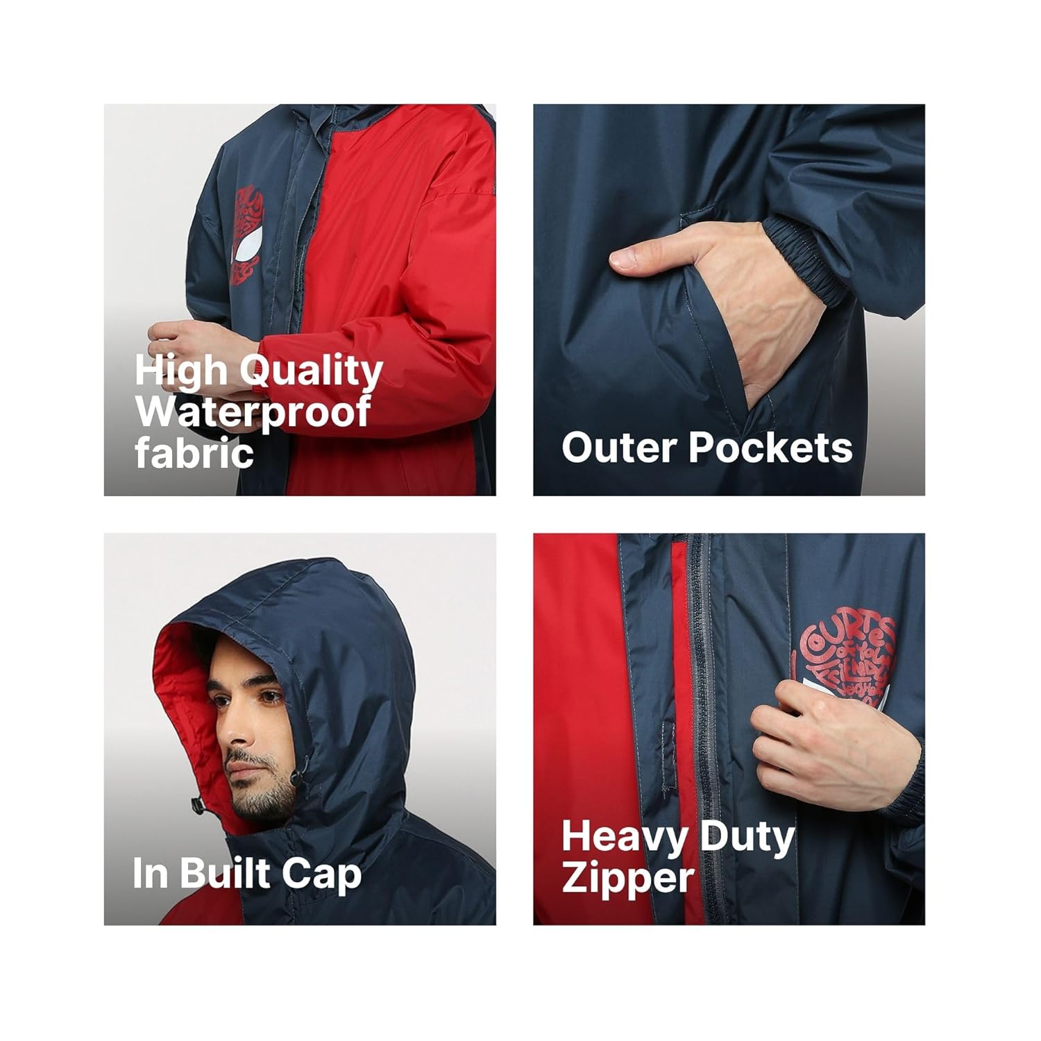 >Introducing the Citizen’s Spiderman Windcheater for Men with Inbuilt Hood. A stylish raincoat with an amazing look and feel. This Rubberized fabric + Taffeta material comes with an inbuilt hood to protect your head from the rain. Be prepared for any sudden downpour or drizzle with a fashionable look. It comes with a sleek solid color design that’s perfect for any outfit.