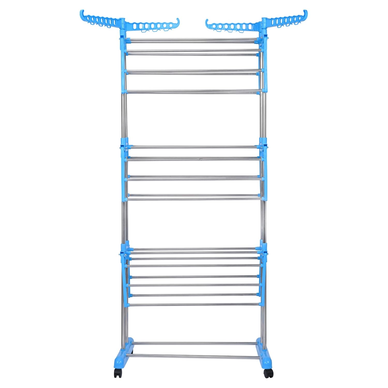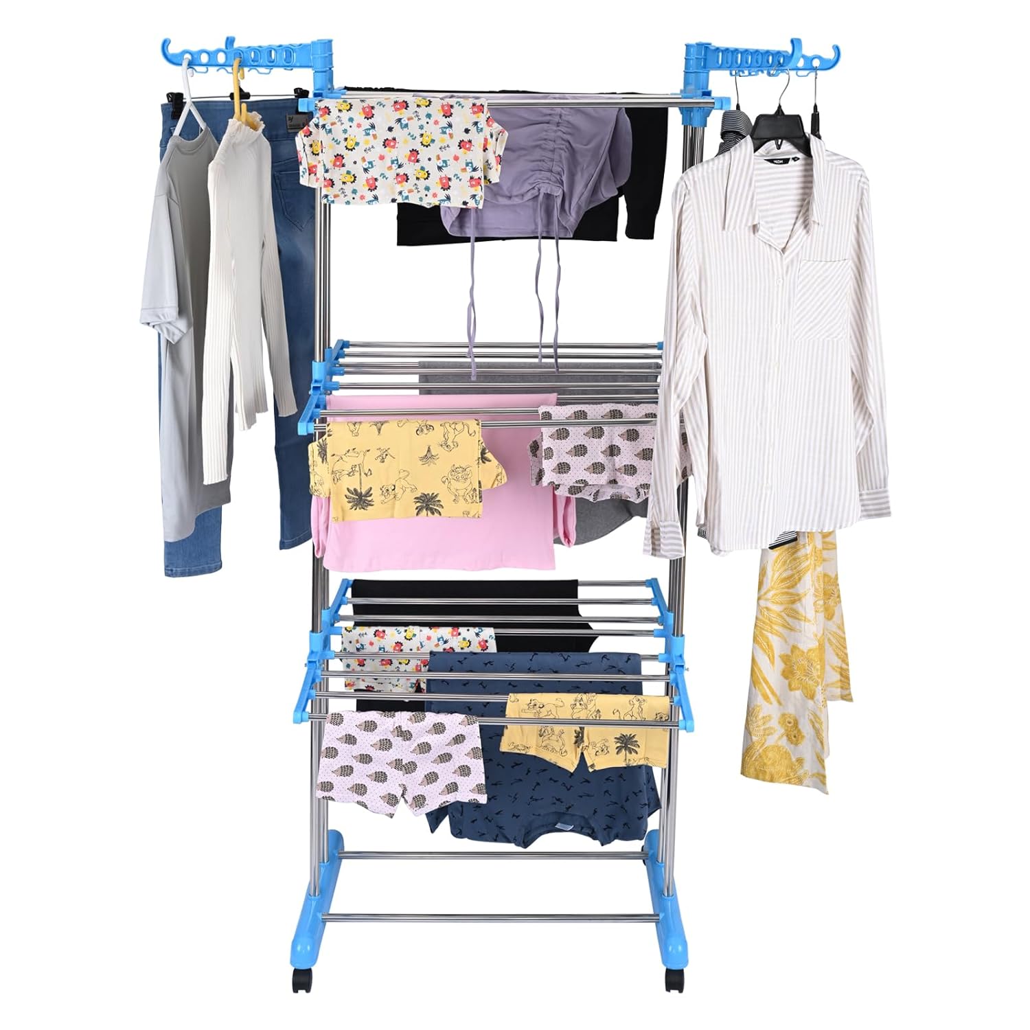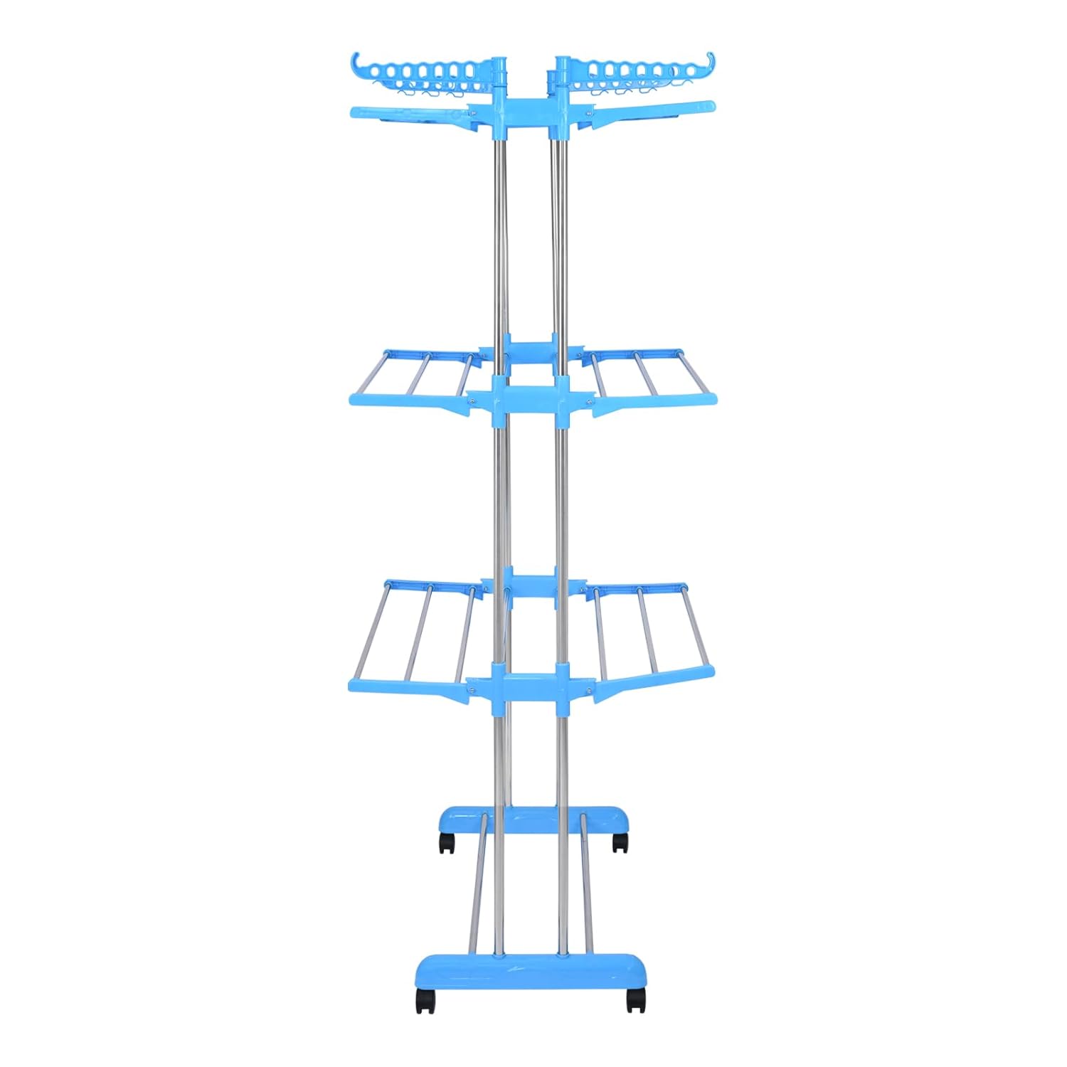 HOMITREE Cloth drying steelnees steel stand for home indoor and outdoor easy the move double poll 3 layer cloth stand Blue Color Heavy Duty Rust-Free Stainless Steel 3-Tier Jumbo Cloth Drying Stand | Clothes Dryer Stands | Laundry Racks with Wheels for Indoor | Outdoor | Balcony HOMITREE Cloth drying Durability: Constructed with high-quality materials, this drying stand is built to last. It can withstand the rigors of regular use and exposure to varying weather conditions. Easy to Use: Setting up and using this cloth drying stand is a breeze. It’s user-friendly, and you can quickly fold it down for storage when not in use, saving you space. Two-Tier Design: With 3-Tiers, you can hang more clothes at once, optimizing the use of vertical space. This feature is especially useful when you have a limited area for drying clothes. Space-Saving Brilliance: Collapsible 6-Hanging Frame Drying Rack with 4 Rails on Each Frame Clever Design: 6 Hanging Frames with 4 Rails Each Adjustable Size: (75-126) x 64 x 170 cm Convenient Side Hangers (2) for Extra Hanging Space Collapsible Feature: Folds Down and Extends Out for Space Conservation Versatile Use: Suitable for Both Indoor and Outdoor Drying Perfect for Small Apartments: Maximizing Hanging Capacity or Saving Space with Ease