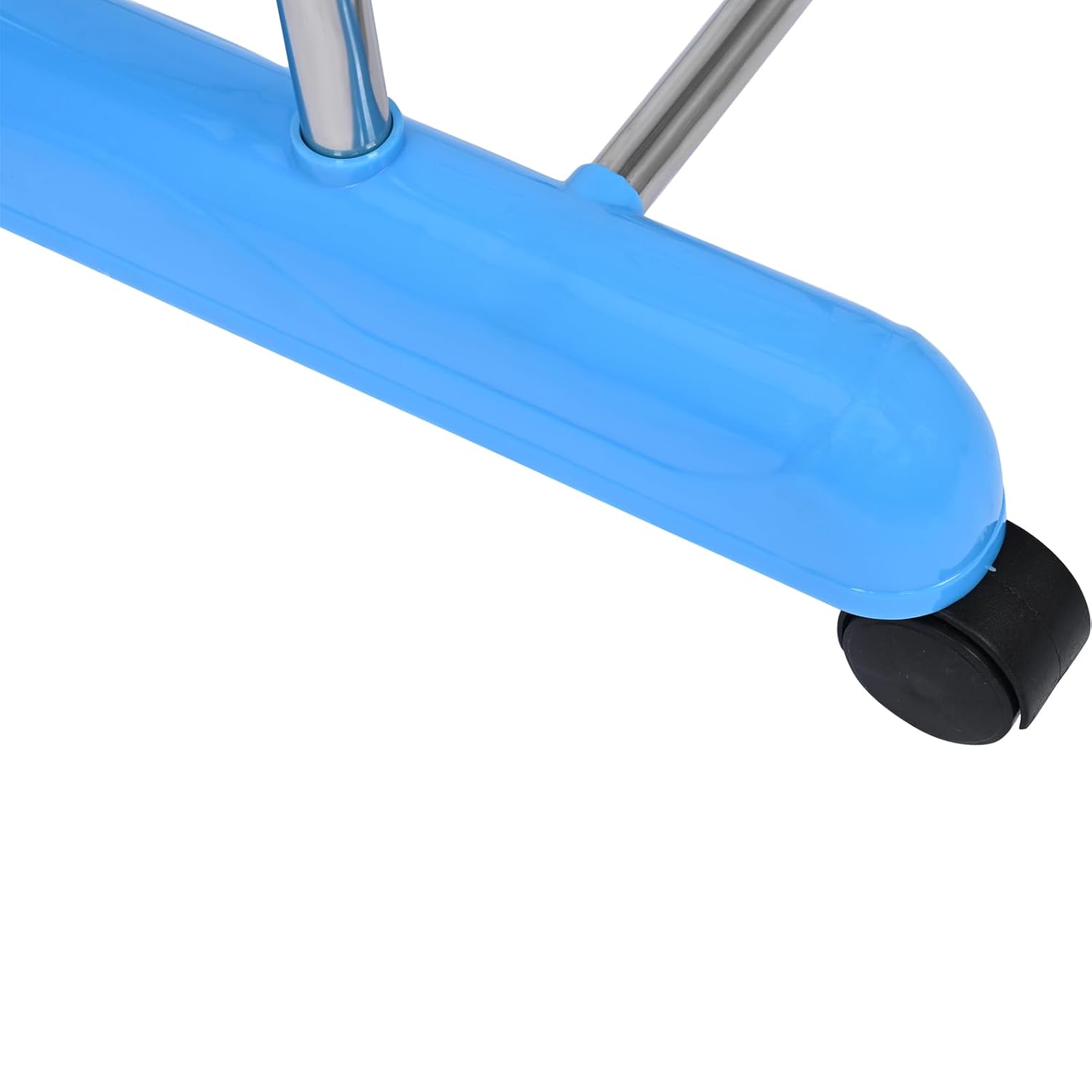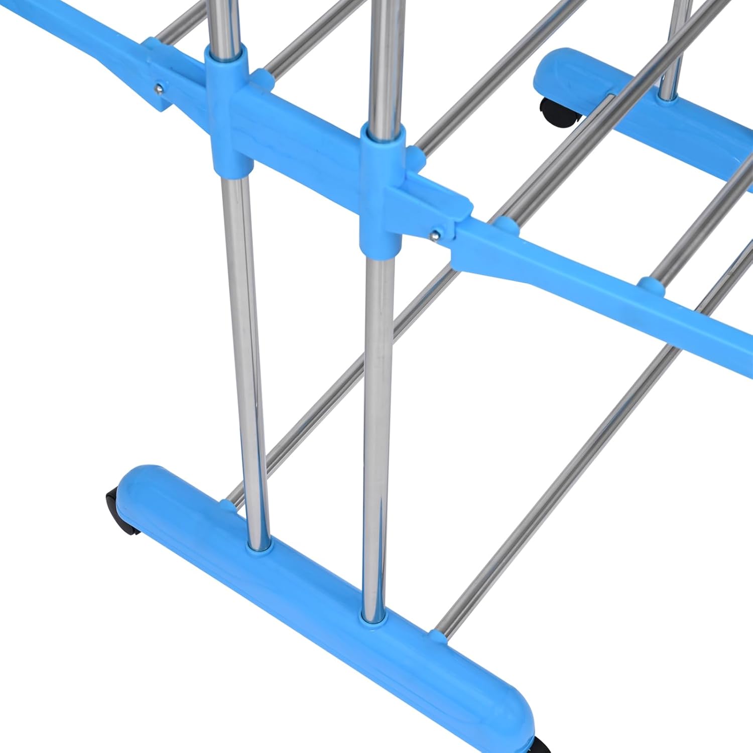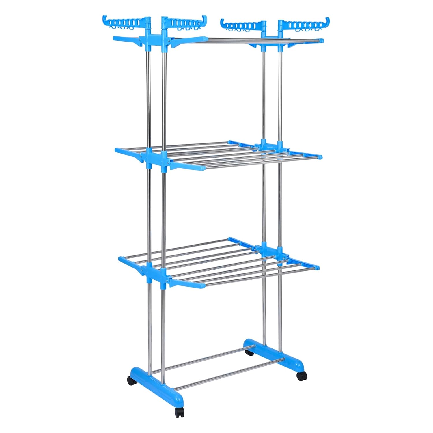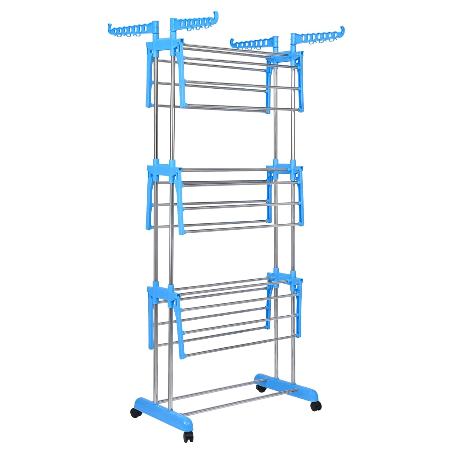HOMITREE Cloth drying steelnees steel stand for home indoor and outdoor easy the move double poll 3 layer cloth stand Blue Color Heavy Duty Rust-Free Stainless Steel 3-Tier Jumbo Cloth Drying Stand | Clothes Dryer Stands | Laundry Racks with Wheels for Indoor | Outdoor | Balcony HOMITREE Cloth drying Durability: Constructed with high-quality materials, this drying stand is built to last. It can withstand the rigors of regular use and exposure to varying weather conditions. Easy to Use: Setting up and using this cloth drying stand is a breeze. It’s user-friendly, and you can quickly fold it down for storage when not in use, saving you space. Two-Tier Design: With 3-Tiers, you can hang more clothes at once, optimizing the use of vertical space. This feature is especially useful when you have a limited area for drying clothes. Space-Saving Brilliance: Collapsible 6-Hanging Frame Drying Rack with 4 Rails on Each Frame Clever Design: 6 Hanging Frames with 4 Rails Each Adjustable Size: (75-126) x 64 x 170 cm Convenient Side Hangers (2) for Extra Hanging Space Collapsible Feature: Folds Down and Extends Out for Space Conservation Versatile Use: Suitable for Both Indoor and Outdoor Drying Perfect for Small Apartments: Maximizing Hanging Capacity or Saving Space with Ease